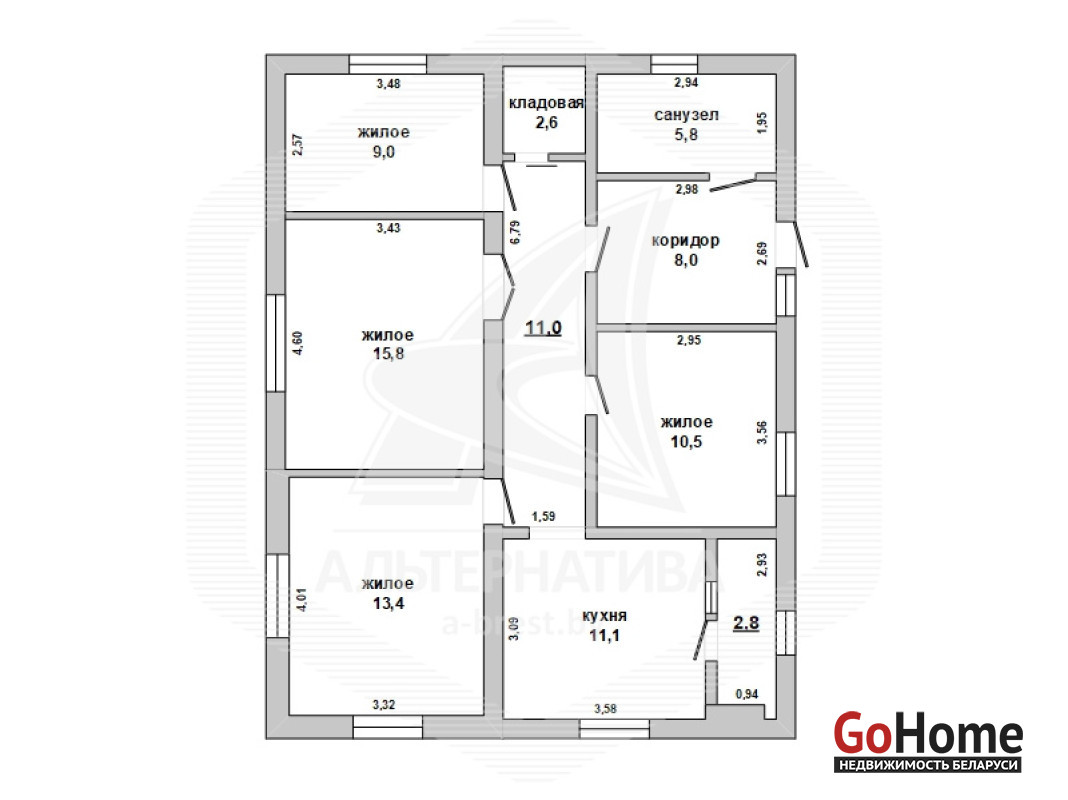 Жилой дом в г.Бресте. 2002 г.п. 1 этаж. Общ.СНБ - 90,0 кв.м, общ.- 90,0 кв.м, жил.- 48,7 кв.м, кух.- 11,1 кв.м. 4 комнаты, высота потолка - 2,37 м.