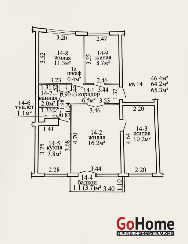 Квартира имеет отличную планировку. Кухня площадью 7,8 м², просторная гостинная - 16,2 м² и 3 спальни. Общая площадь составляет 65,3 м². Санузел раздельный. Есть лоджия 3,7 м². К квартире прилагается большой подвал, что решает проблему хранения велосипедов, санок, чемоданов, картошки и прочих вещей.
