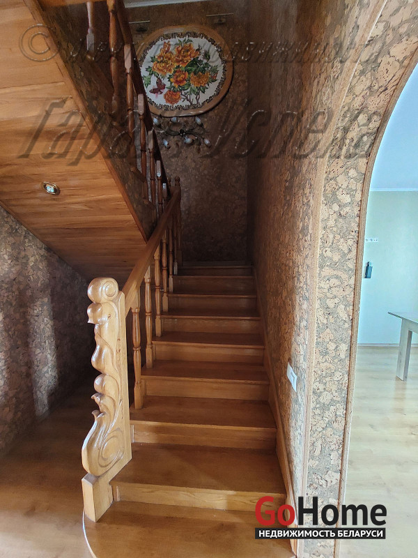 Центральным элементом интерьера является безопасная лестница, выполненная из массива дуба. Оформление помещения выполнено все в едином стиле с преобладанием нейтральных цветов. На кухне плитка с подогревом,