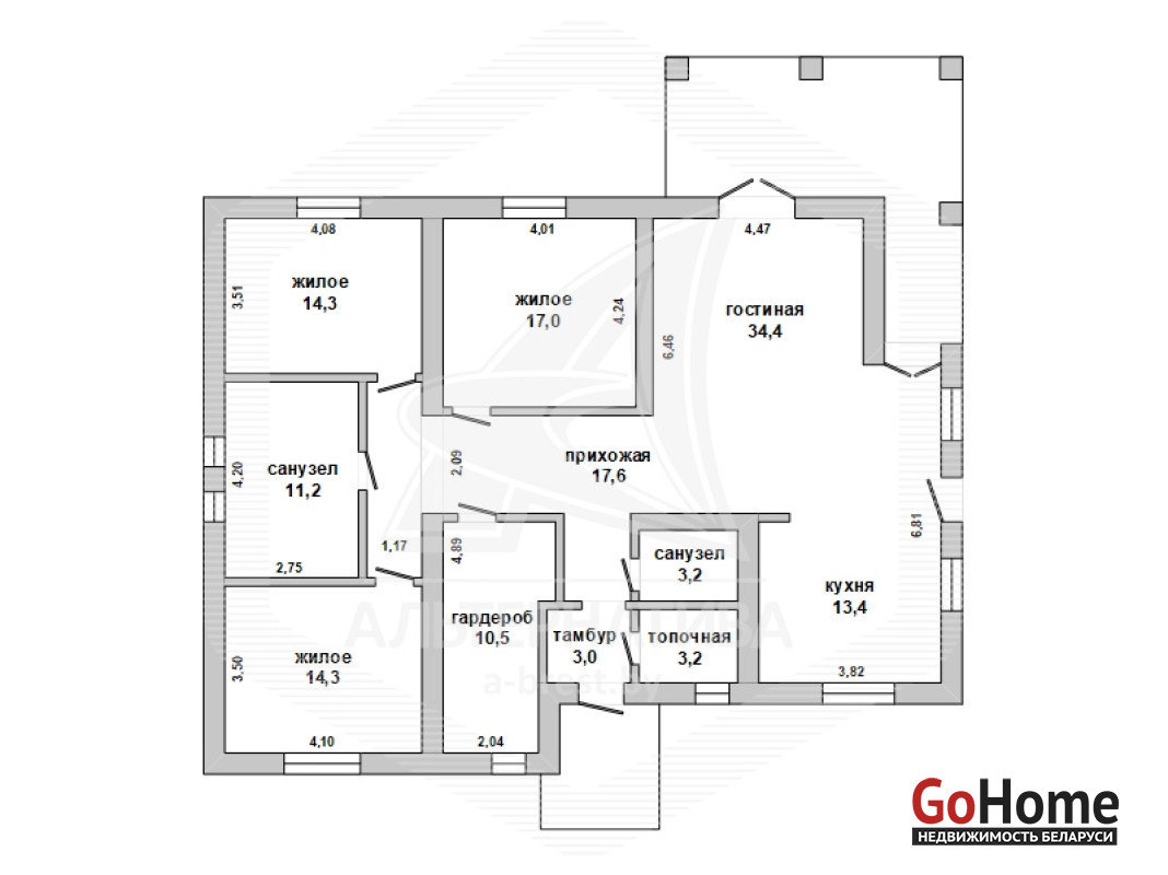 Жилой дом в г.Бресте. 2018 г.п. 1 этаж. Общ.СНБ - 149,4 кв.м, общ.- 142,1 кв.м, жил.- 80,0 кв.м, кух.- 13,4 кв.м. 4 комнаты, высота потолка - 2,80 м.