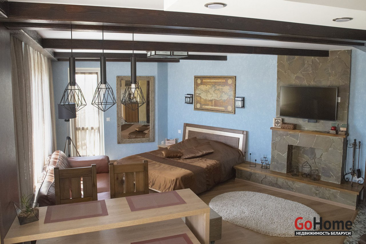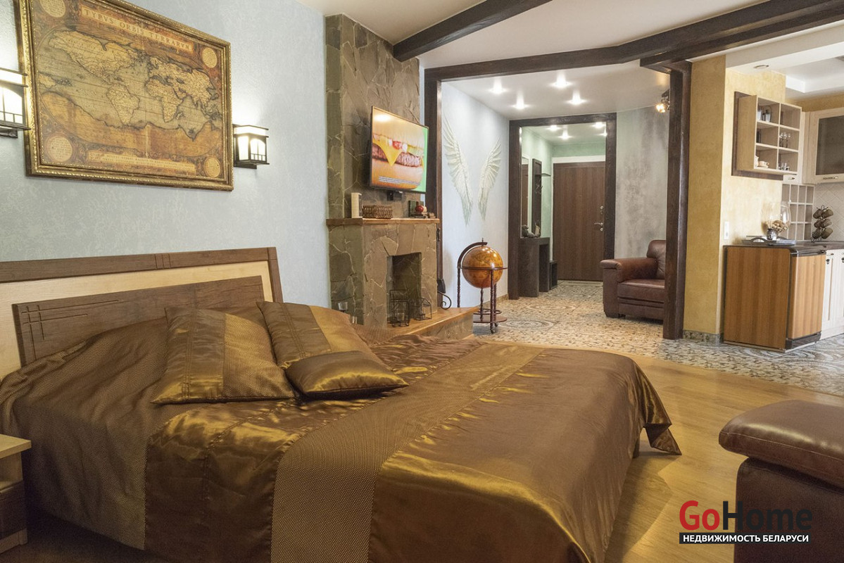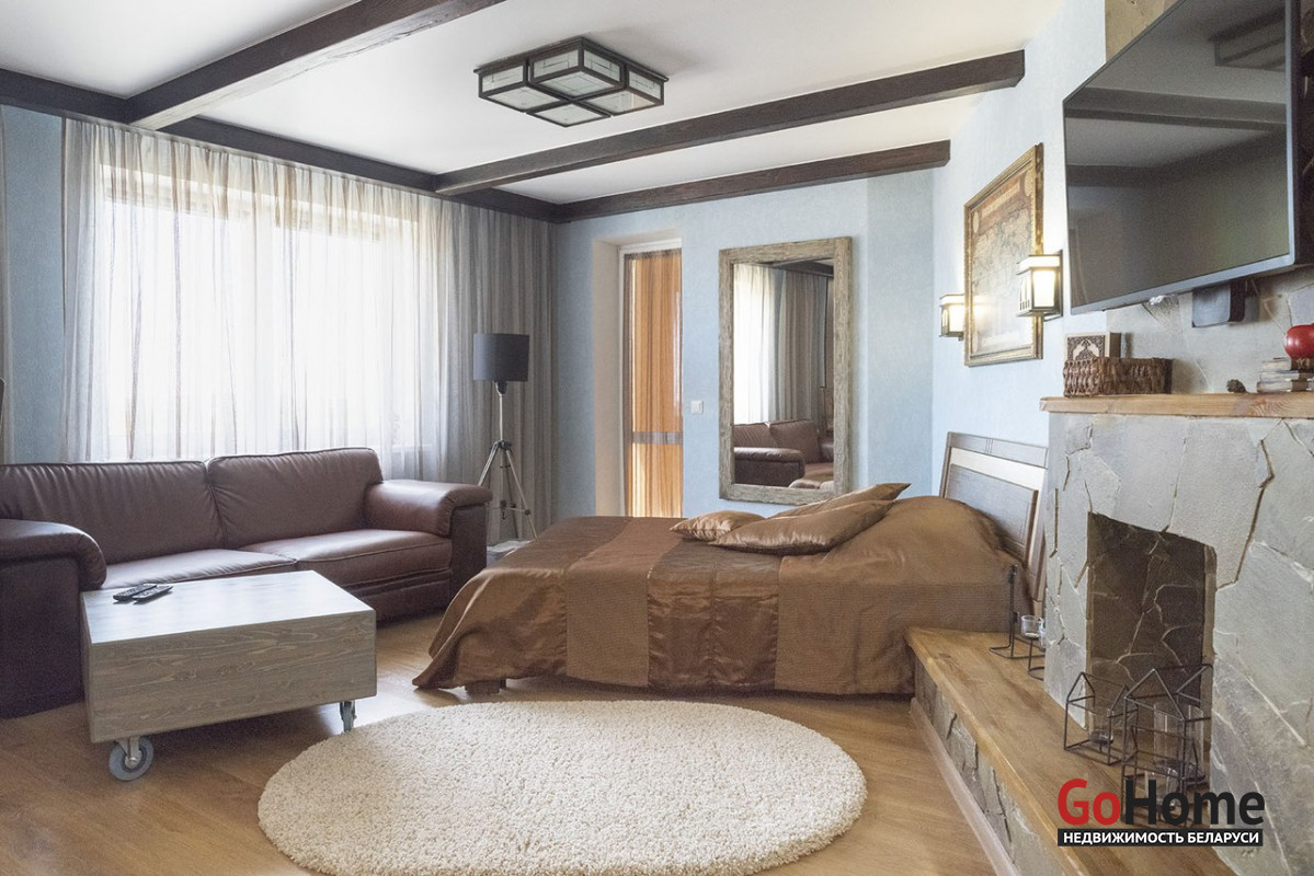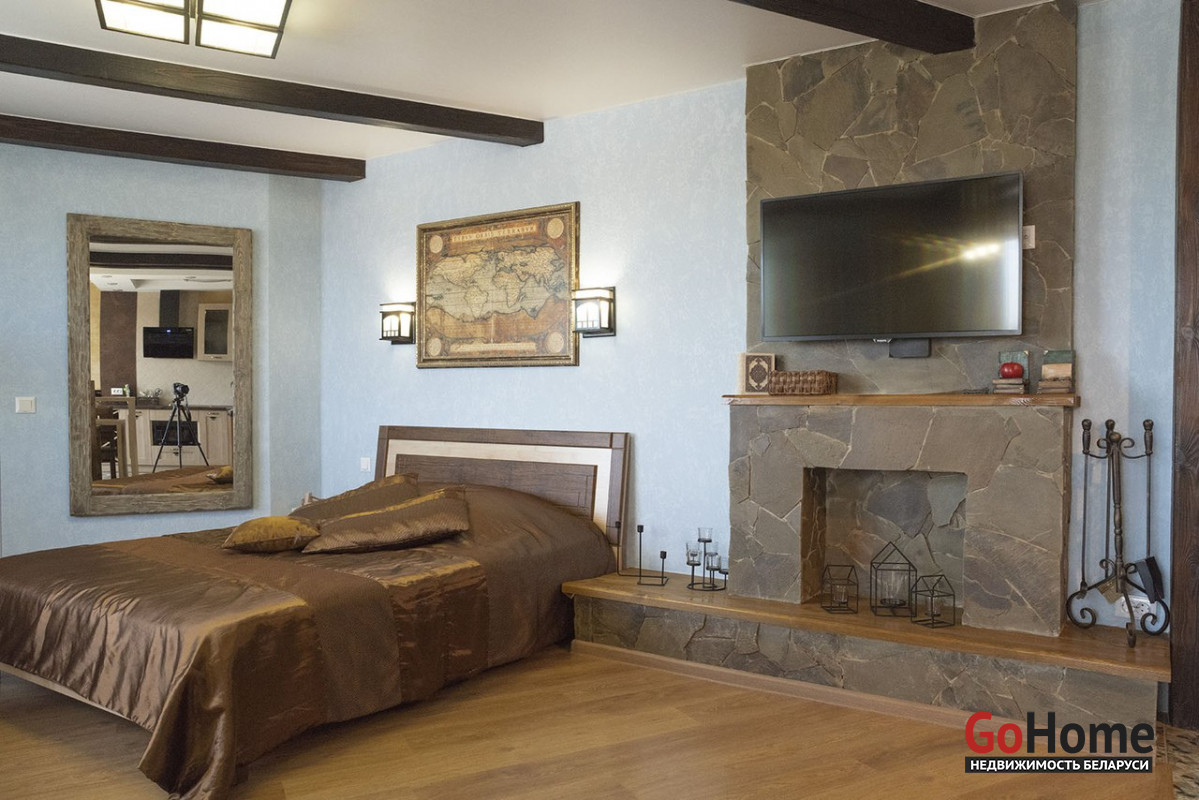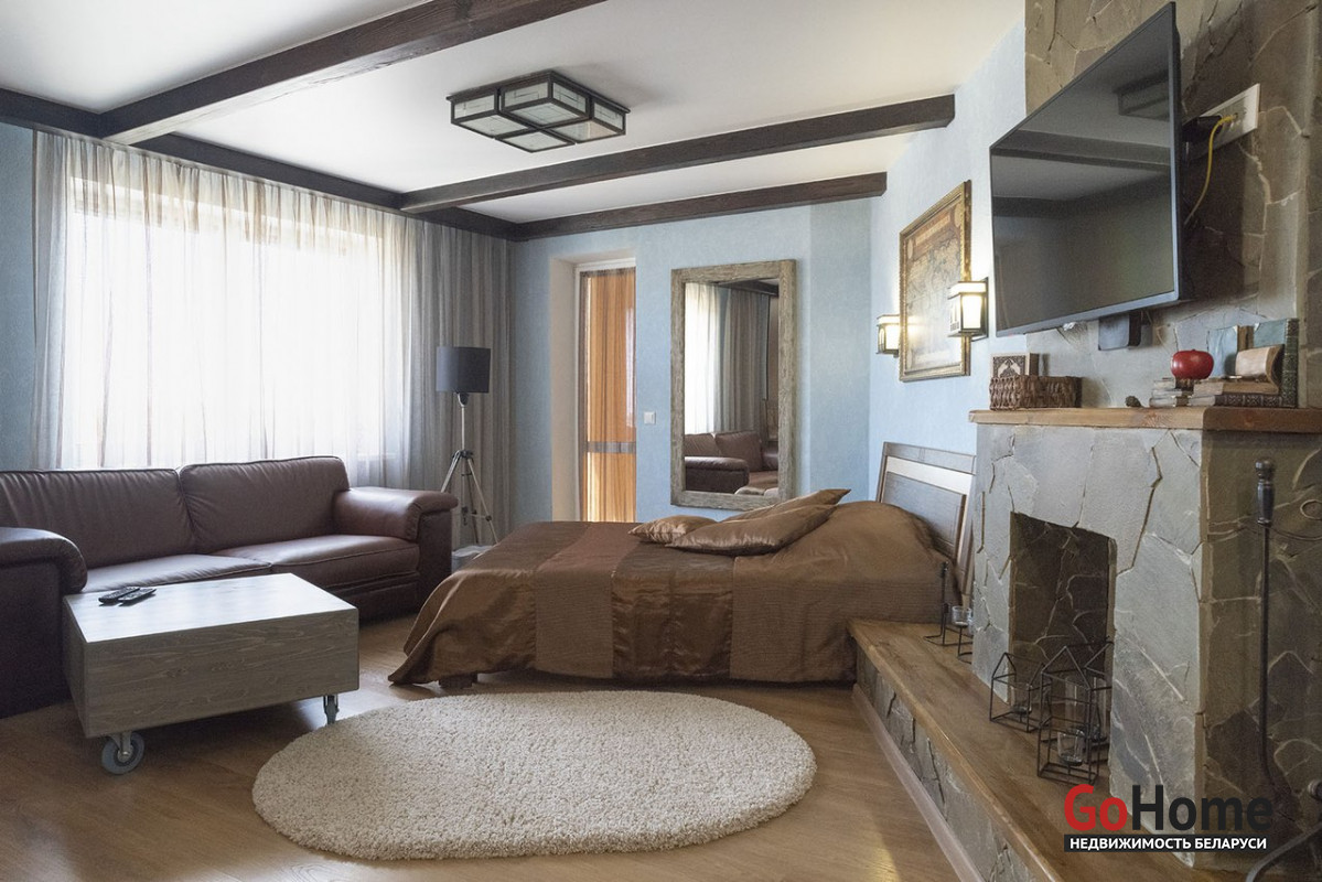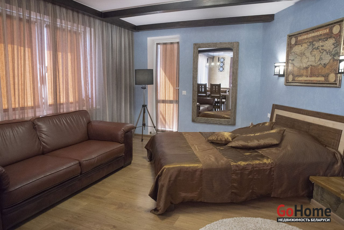 Здесь чувствуется дизайнерский стиль, ощущение комфорта и тепло домашнего уюта. На стены нанесена Венецианская штукатурка. Внушительных размеров кровать с ортопедическим матрасом и свежим постельным бельем, обещает приятные сновидения, крепкий, здоровый сон, бодрость и уверенность в себе с утра. Диван и кресло из натуральной кожи.