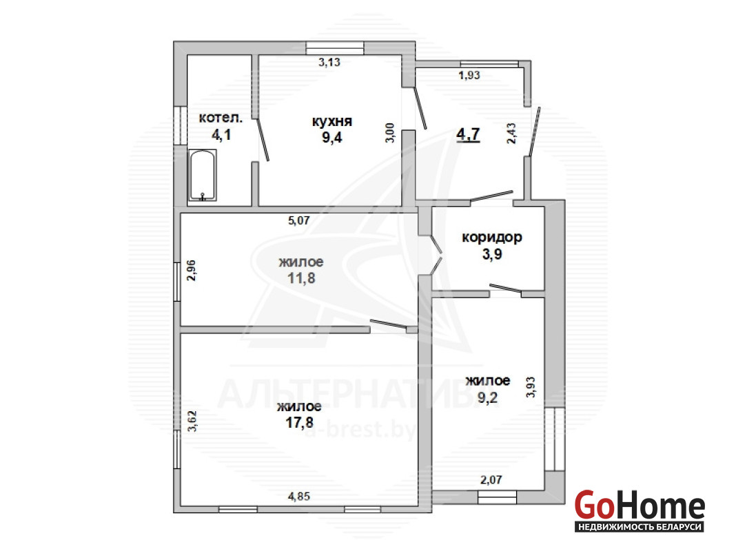 Жилой дом в г.Жабинке. 1961 г.п. 1 этаж. Общ.СНБ - 100,0 кв.м, общ.- 100,0 кв.м, жил.- 59,0 кв.м, кух.- 9,4 кв.м. 3 комнаты, высота потолка - 2,50 м.