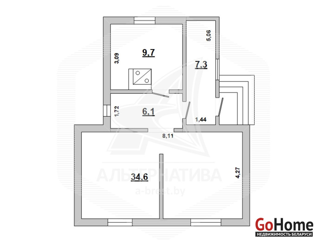 Жилой дом в Каменецком р-не. 2013 г.п. 1 этаж. Общ.СНБ - 57,7 кв.м, общ.- 57,7 кв.м, жил.- 34,6 кв.м, кух.- 9,7 кв.м. 2 комнаты, высота потолка - 2,97 м.