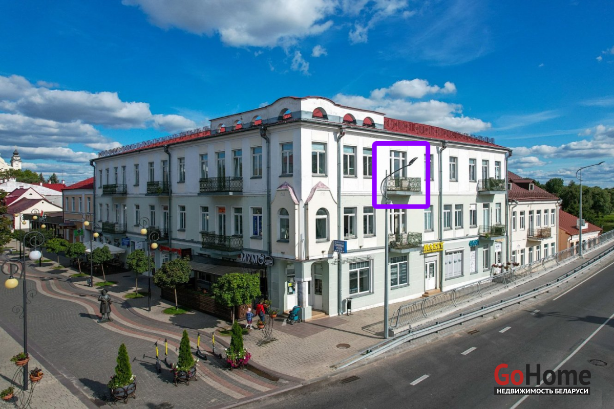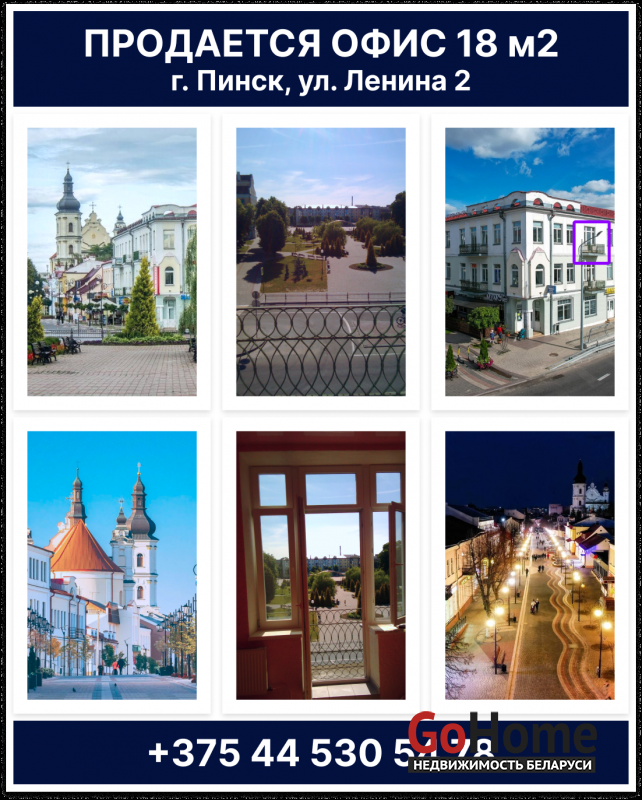 Офис находится в г.Пинске (исторический центр города) ул.Ленина 2, 3-й этаж (на фото выделен фиолетовым квадратом) — 18 м2, балкон — 3 м2, высота потолка — 3,60 м (фактически занижен до 3 метров). Балконная дверь — 2,80 м. Пол — натуральное дерево (лак). Входная группа из 2-х дверей (расстояние между ними 0,5 м с внутренним освещением между дверями). На потолке 4 пятирожковые люстры с раздельным выключением, 3 (керамические) розетки, электрощиток внутри помещения. Нал/безнал. Цена договорная.