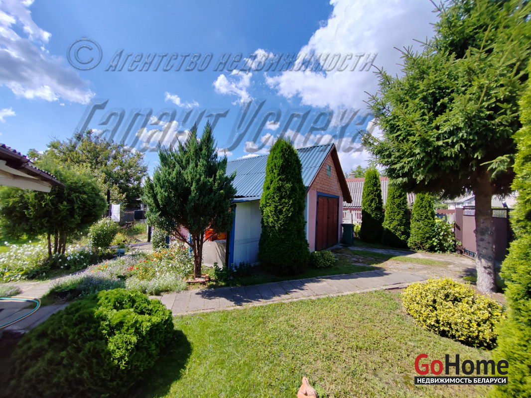 Участок правильной, практически квадратной формы размером 7,63 сотки со всех огорожен бетонным секционным забором. Помимо дома на нём расположен капитальный гараж, баня (требуется ремонт), помещение для домашних птиц. На территории высажены хвойные декоративные растения, множество цветущих растений и плодовых деревьев и кустарников.