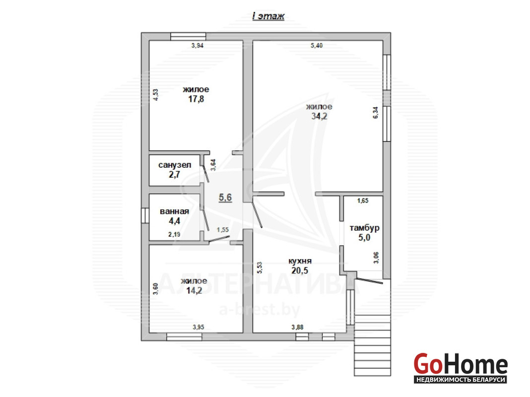 Жилой дом в г.Бресте. 2000 г.п. 1 этаж, мансарда. Общ.СНБ - 207,5 кв.м, общ.- 104,4 кв.м, жил.- 66,2 кв.м, кух.- 20,5 кв.м. 3 комнаты, высота потолка - 2,70 м.