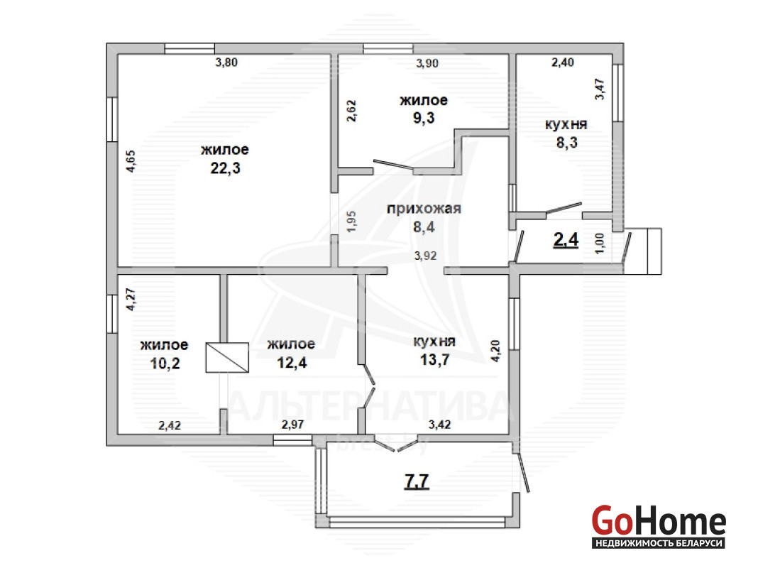 Тех. хар-ка продаваемой части дома: общ.СНБ - 82,8 кв.м, общ.- 76,1 кв.м, жил.- 47,4 кв.