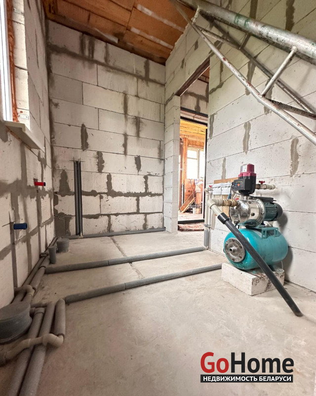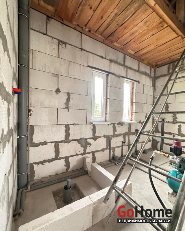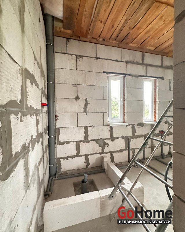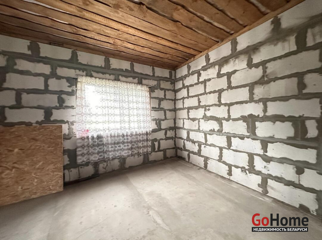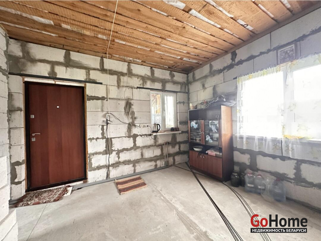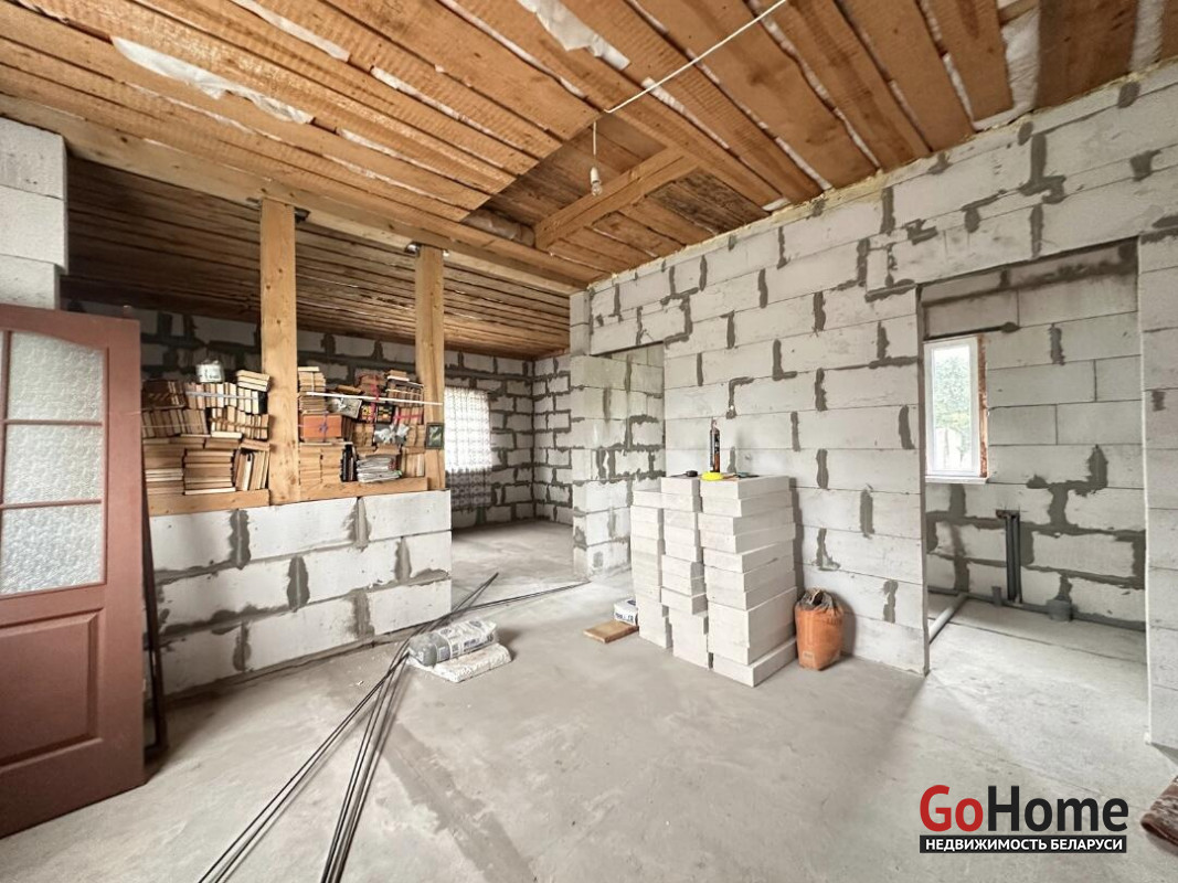 Коробка дома в д. Чижевщина Жабинковского района. Фундамент монолитный армированный, стены из газосиликаиных блоков, крыша - шифер, к дому пристроена деревянная веранда. Установлены окна ПВХ, входная дверь металлическая, на первом этаже на полу залита стяжка. Площадь первого этажа 60 м кв. На первом этаже запланированы: спальня, кухня гостиная, сан узел и лестница на мансардный этаж. На мансардном этаже запланированы 2 комнаты. Со второго этажа открывается прекрасный вид на лес. В дом введено электричество, есть разводка канализации. Участок 25 соток.