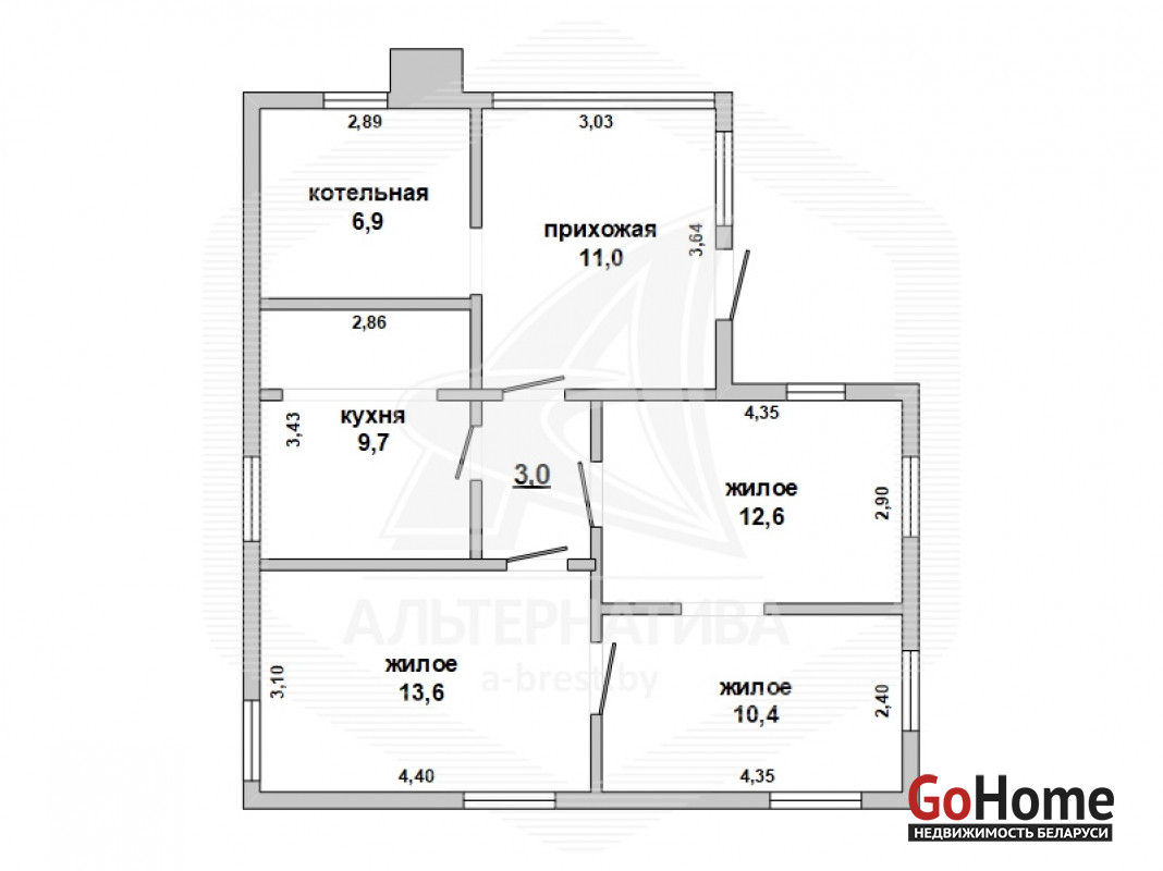 4-комнатная, 68.7/43.4/10.5 м2, (14.5 соток), 1 эт.