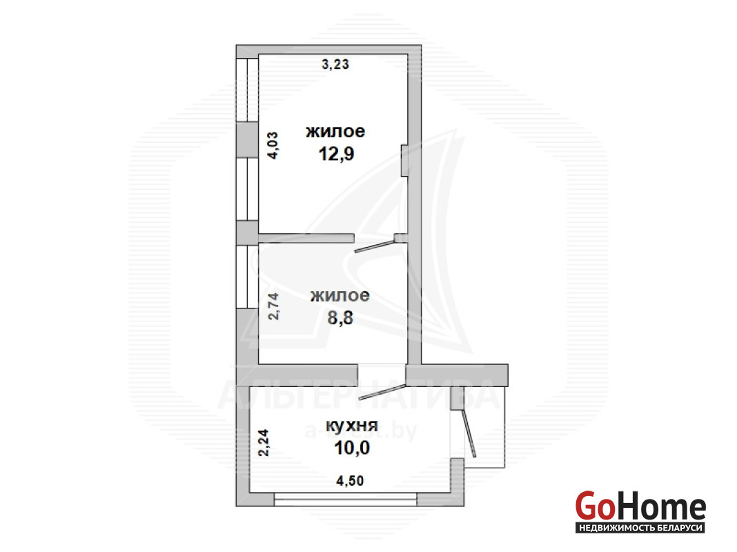 Квартира в блокированном жилом доме в г.Бресте. 1962 г.п. 1 этаж. Общ.СНБ - 31,7 кв.м, общ.- 31,7 кв.м, жил.- 21,7 кв.м, кух.- 10,0 кв.м. 2 комнаты, высота потолка - 2,77 м.