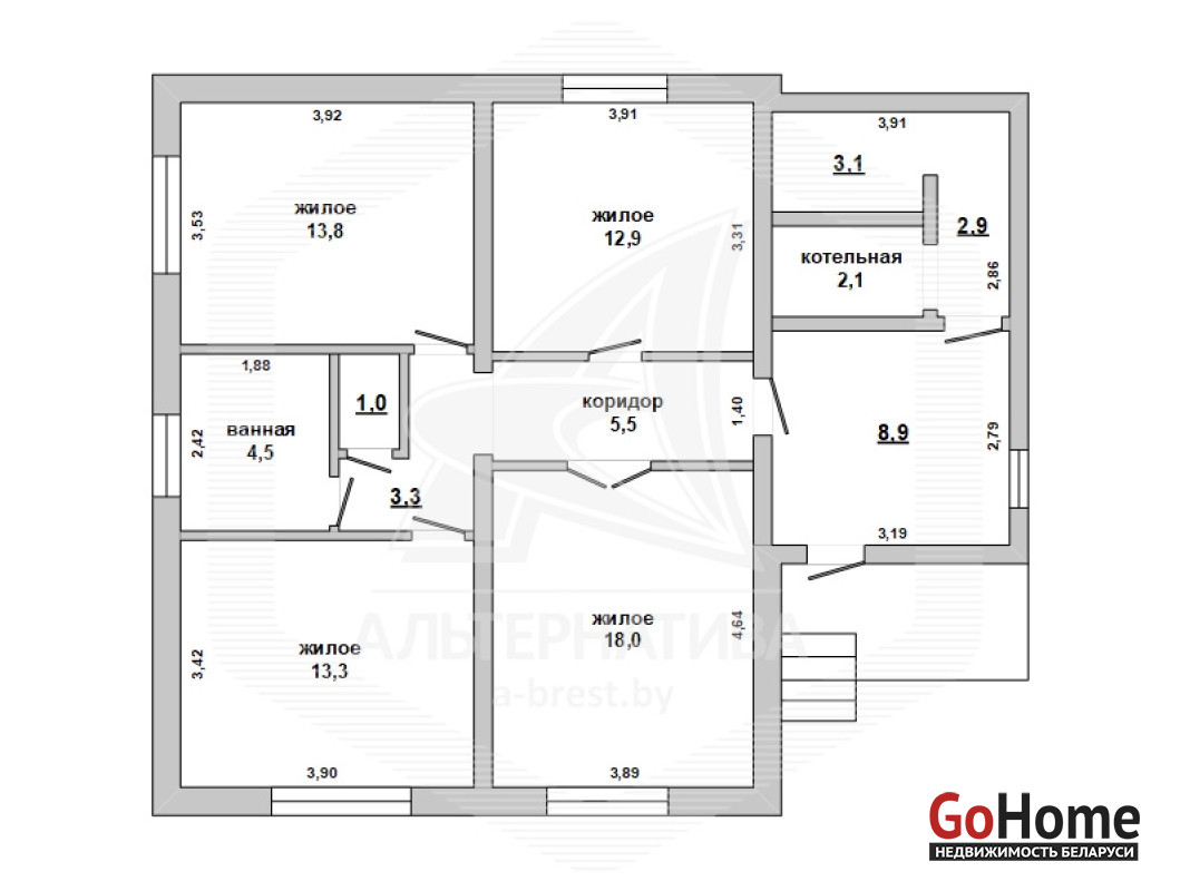 Жилой дом в Жабинковском р-не. 2006 г.п. 1 этаж. Общ.СНБ - 89,3 кв.м, общ.- 74,4 кв.м, жил.- 45,1 кв.м, кух.- 12,9 кв.м. 3 комнаты, высота потолка - 2,80 м.