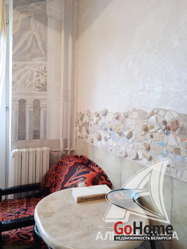 1-комнатная квартира, г. Брест, б-р Космонавтов, 1958 г.п., 3 / 3 кирпич, 31,3 / 30,7 / 19,4 / 4,6, санузел совмещенный, балкон, деревянные стеклопакеты, входная дверь металлическая, потолки - снежка, полы - ламинат, стены - отделка камнем, художественная роспись и декоративная окраска, в санузле современная плитка, заменена сантехника, заменен полотенцесушитель, заменены сантехнические трубы, домофон. Квартира с индивидуальными дизайнерскими решениями. Капитальный ремонт дома. Лот - 240033