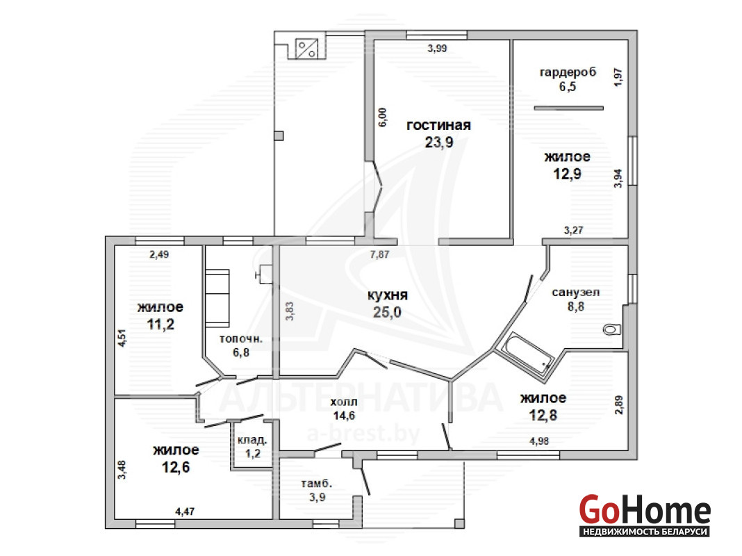 Жилой дом в г.Бресте. 2014 г.п. 1 этаж. Общ.СНБ - 144,7 кв.м, общ.- 140,2 кв.м, жил.- 79,9 кв.м, кух.- 25,0 кв.м. 5 комнат, высота потолка - 2,75 м.
