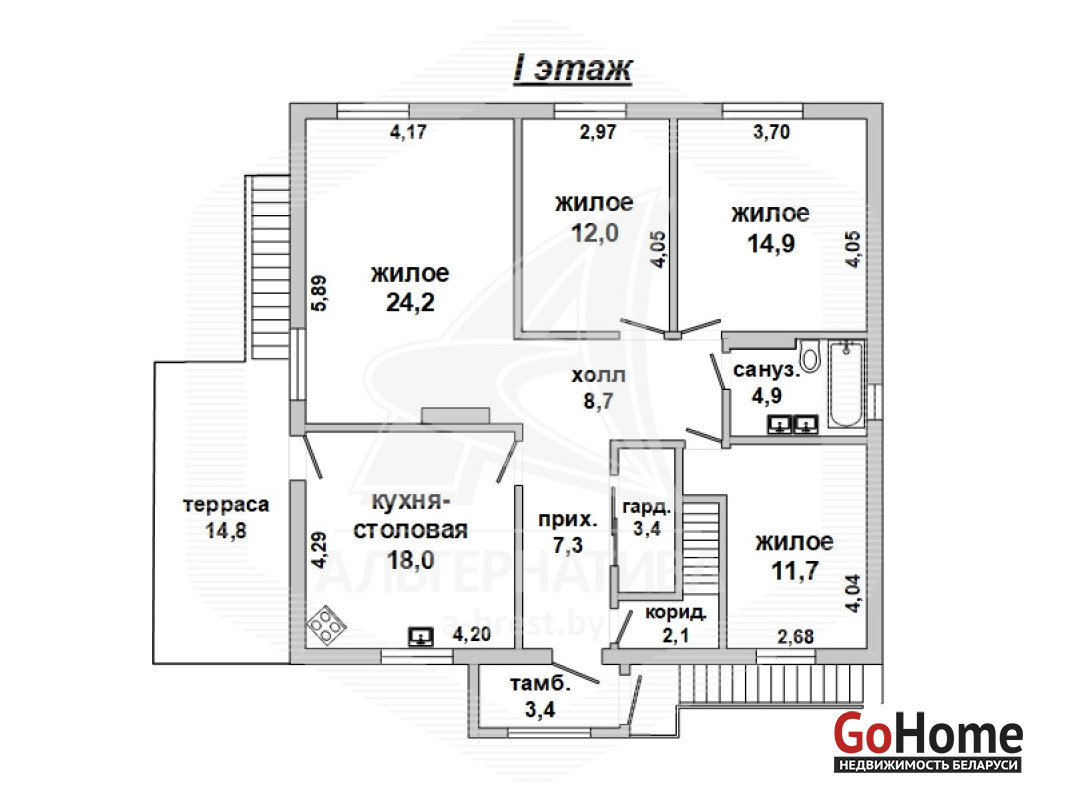 Коробка жилого дома в г.Бресте. 1 этаж, цокольный этаж. Общ.СНБ - 227,1 кв.м, жил.- 62,8 кв.м, кух.- 18,0 кв.м. 4 комнаты, высота потолка - 2,95 м.