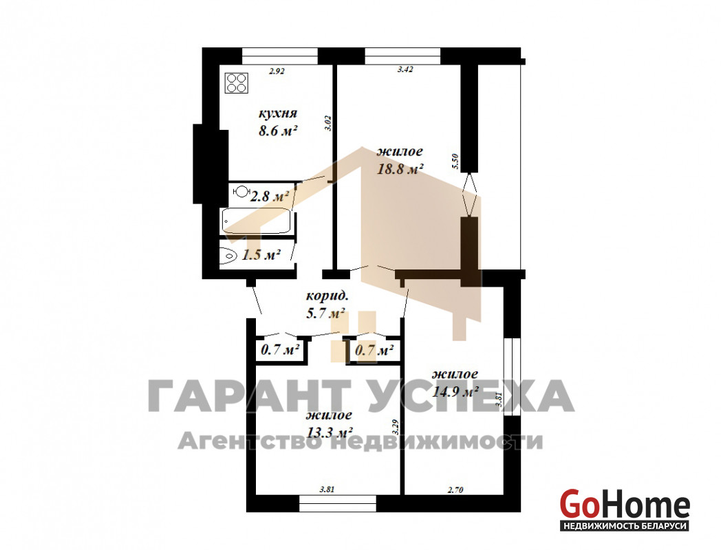 Характеристики: комнаты по 18,8 13,3 14,9 кв. м, кухня 8,6 кв. м.