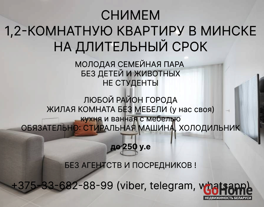 Снимем 1,2-комнатную квартиру в Минске на длительный срок.