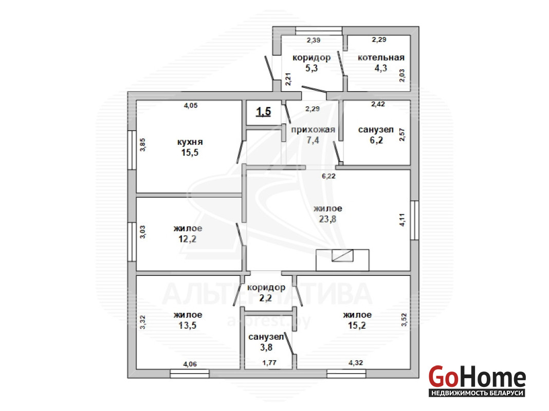 Жилой дом в Каменецком р-не. 2005 г.п. 1 этаж. Общ.СНБ - 110,9 кв.м, общ.- 110,9 кв.м, жил.- 64,7 кв.м, кух.- 15,5 кв.м. 4 комнаты, высота потолка - 2,65 м.