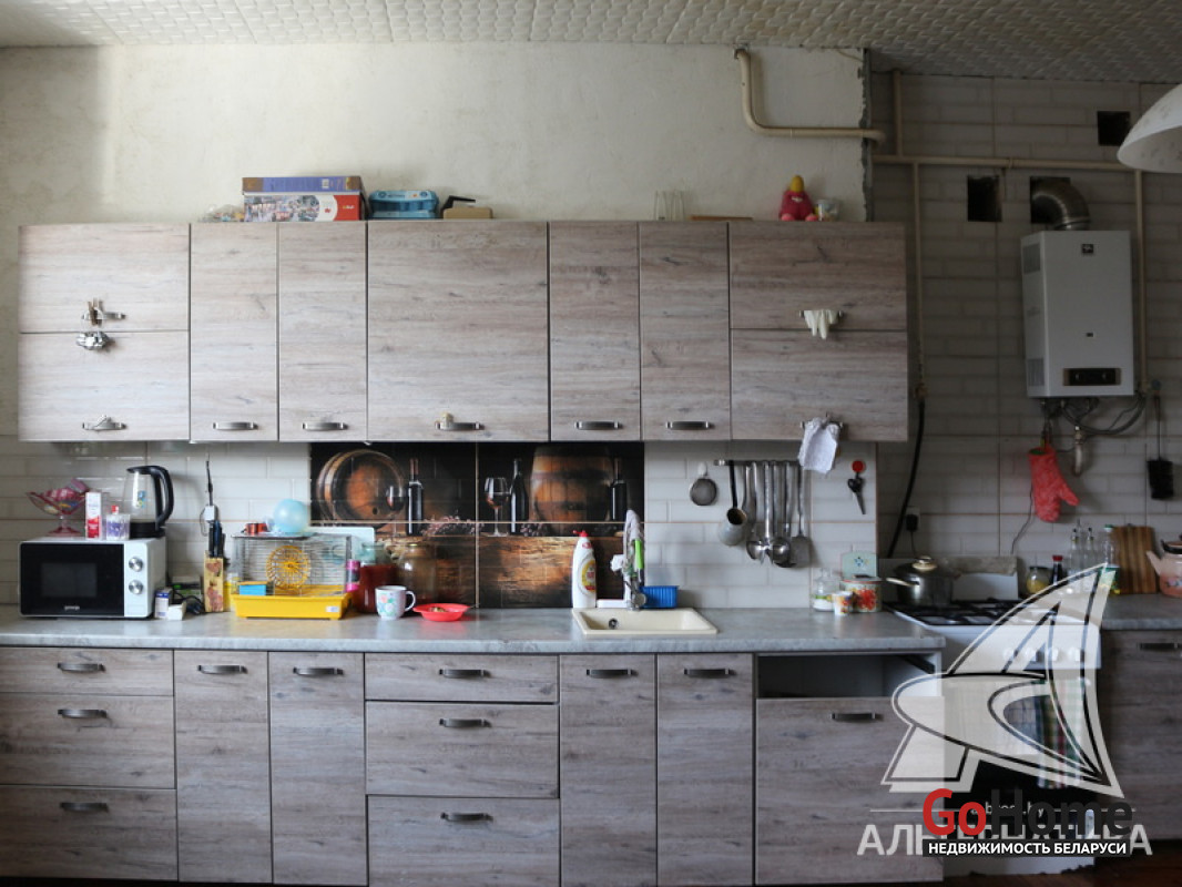Коммуникации: отопление - газовый котел и твердотопливный, газ - централизованный (в доме), водоснабжение - централизованный водопровод, электричество - централизованное, канализация - централизованная.