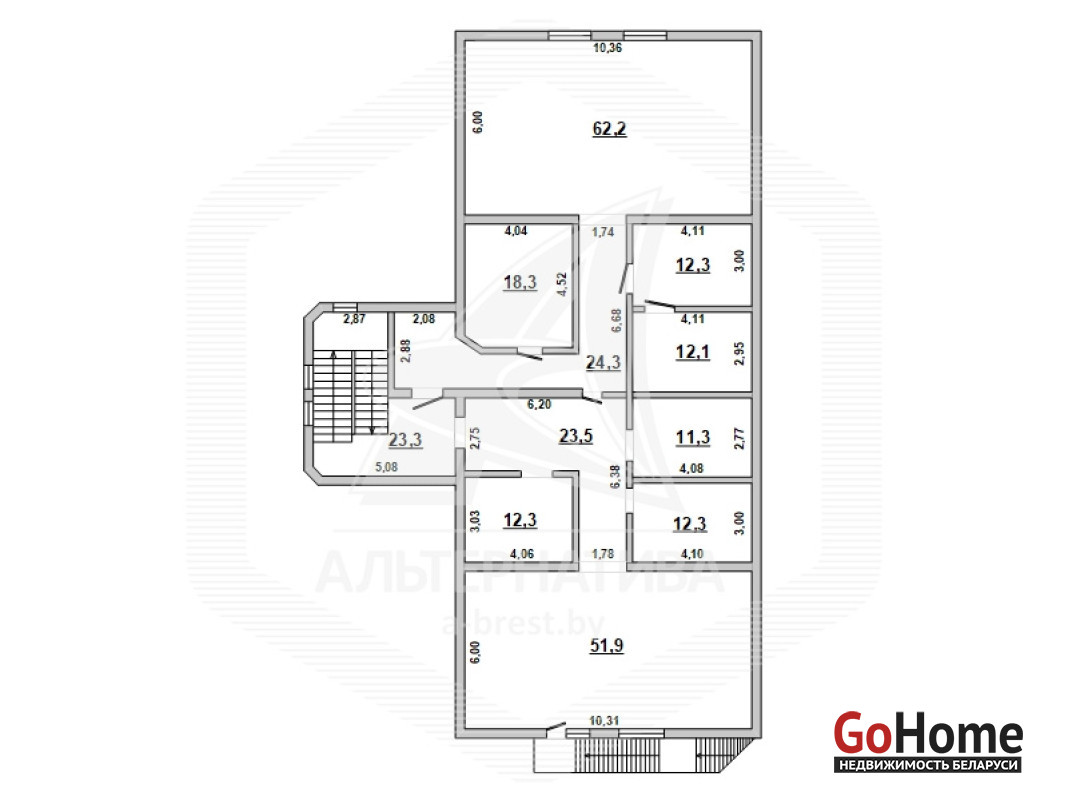 Административное помещение в аренду в районе Восток города Бреста общей площадью 273,8 кв.м. Помещение расположено на 3 (третьем) масардном этаже административного здания. Состоит из 8 рабочих кабинетов разной площади (62,2 + 12,3 + 12,1 + 18,3 + 11,3 + 12,3 + 12,3 + 51,9 кв.м). Технические характеристики помещения: полы - плитка, стены оштукатурены, окрашены, окна, двери - ПВХ. Оборудована пожарная сигнализация, установлены индивидуальные приборы учета электроэнергии и водоснабжения. Оптоволоконная сеть введена в здание. Собственная парковка. Рассматриваются варианты cдачи в аренду части помещения площадью от 129,2 кв.м. Лот - 240015A