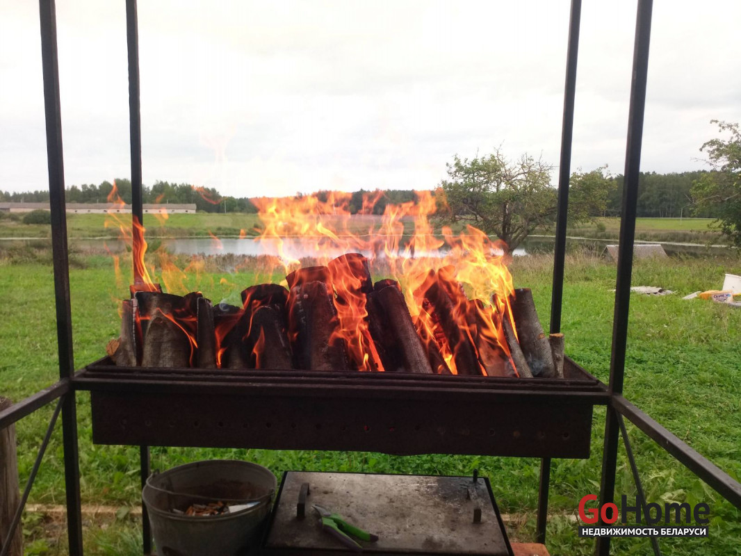 Также есть большая беседка, мангальная зона, коптильня для горячего копчения. Баня по-черному прямо на берегу озера.