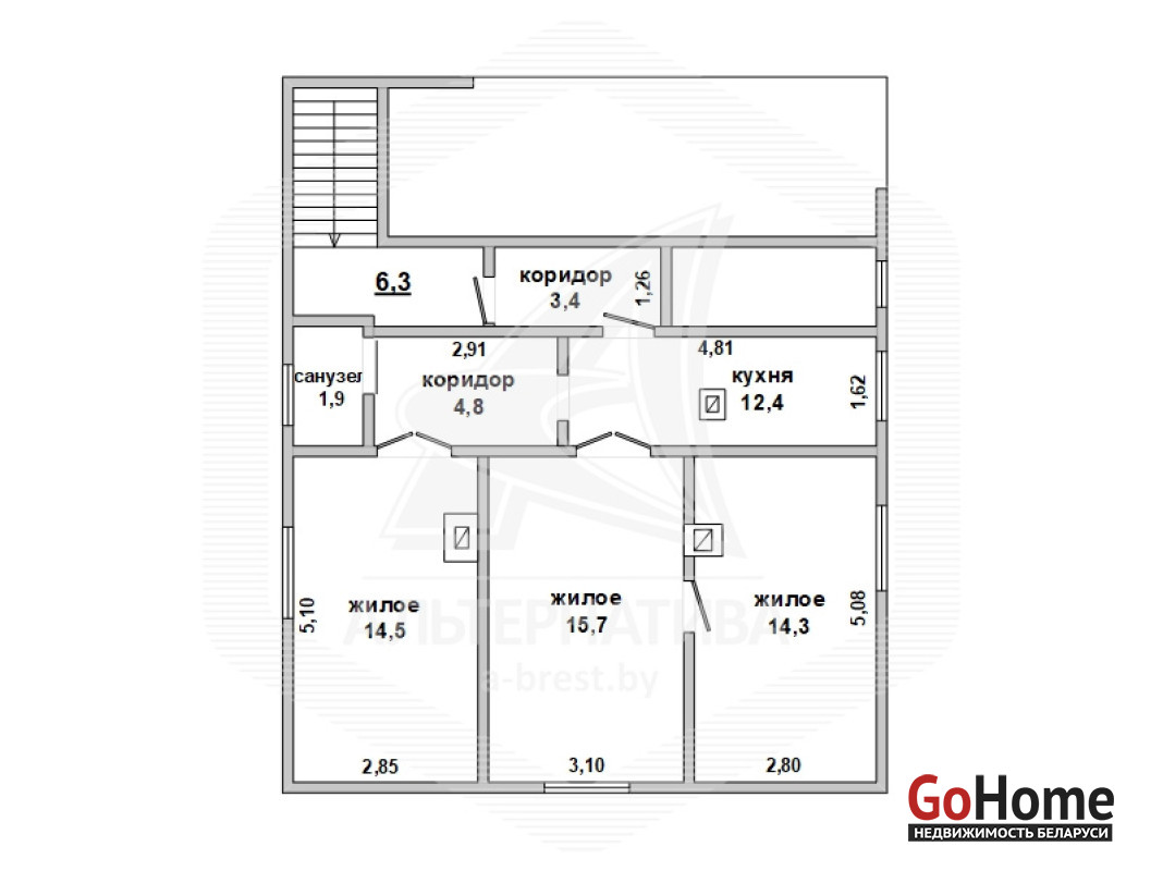 Квартира в блокированном жилом доме в г.Бресте. 1938 г.п. 2 этажа. Общ.СНБ - 73,3 кв.м, общ.- 67,0 кв.м, жил.- 44,5 кв.м, кух.- 12,4 кв.м. 3 комнаты, высота потолка - 2,5 м.