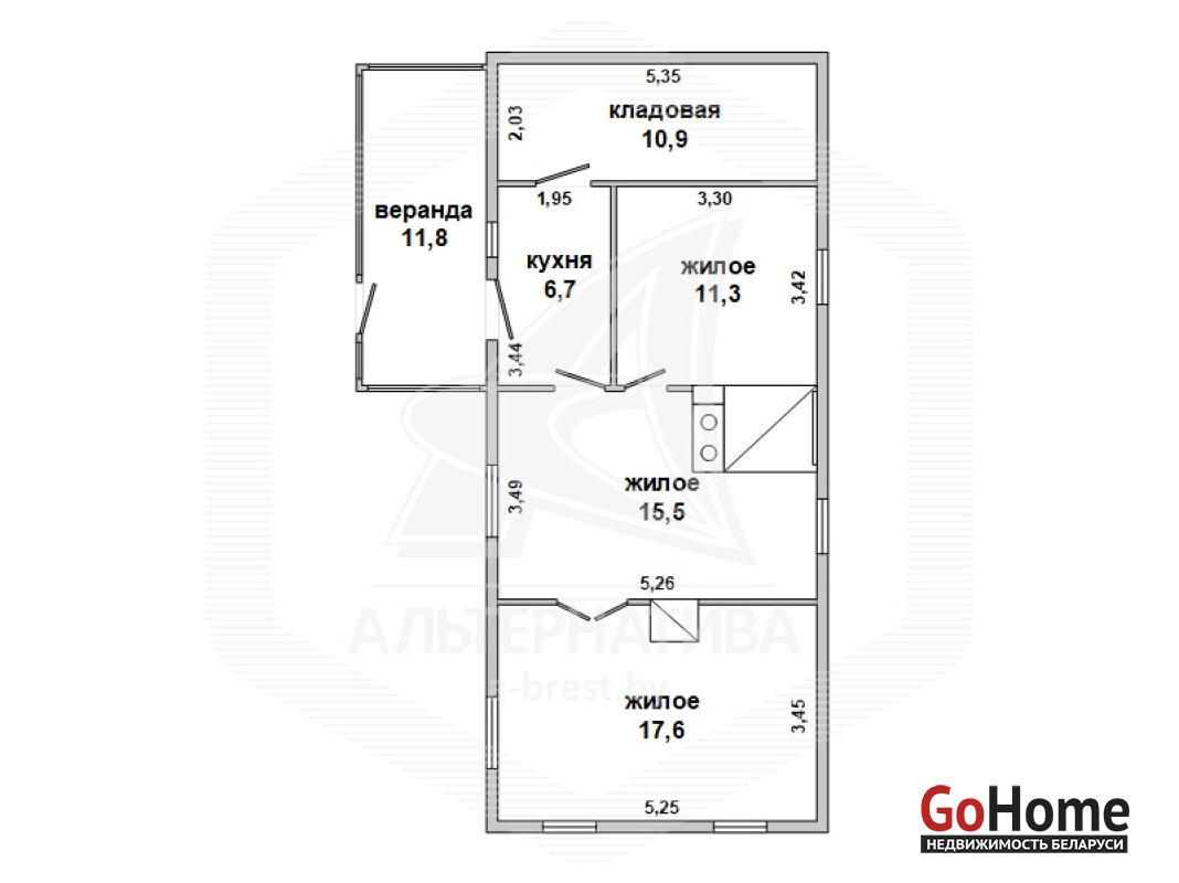Жилой дом в Пружанском р-не. 1959 г.п. 1 этаж. Общ.СНБ - 73,8 кв.м, общ.- 62,0 кв.м, жил.- 44,3 кв.м, кух.- 6,7 кв.м. 3 комнаты, высота потолка - 2,46 м.