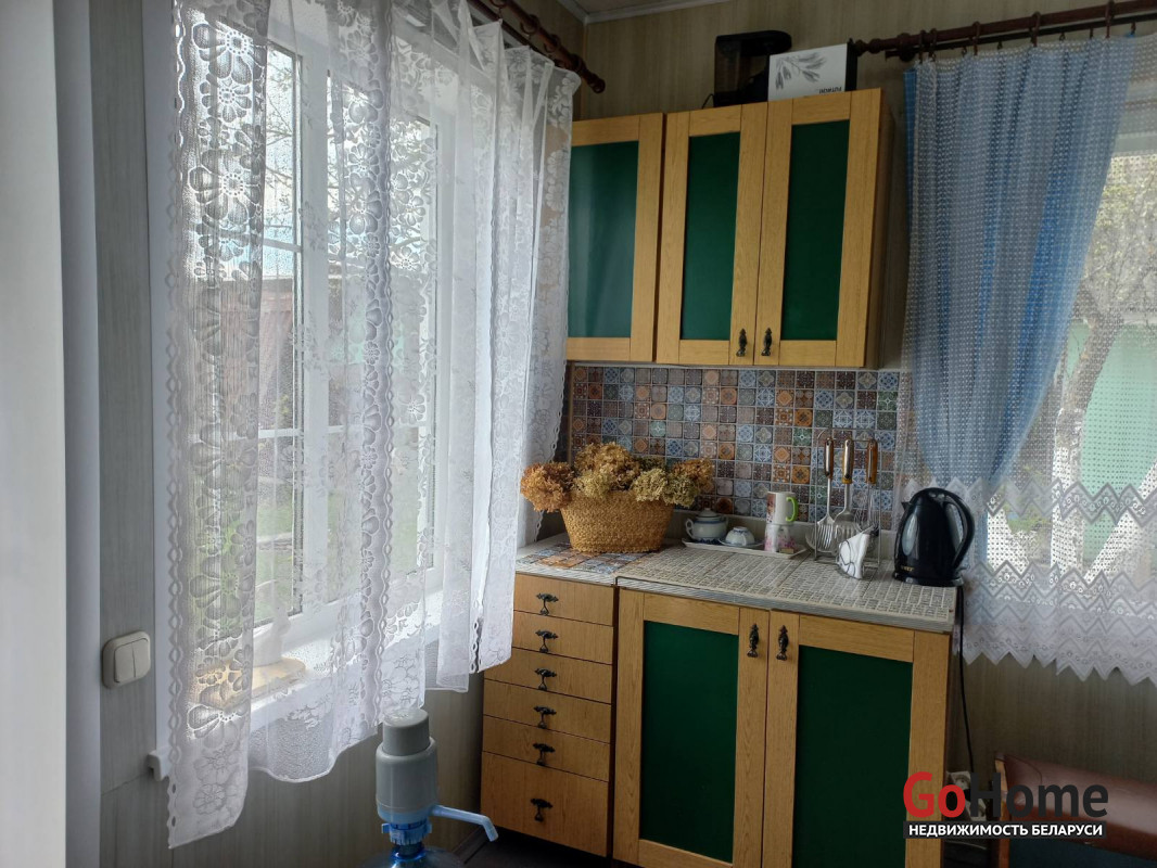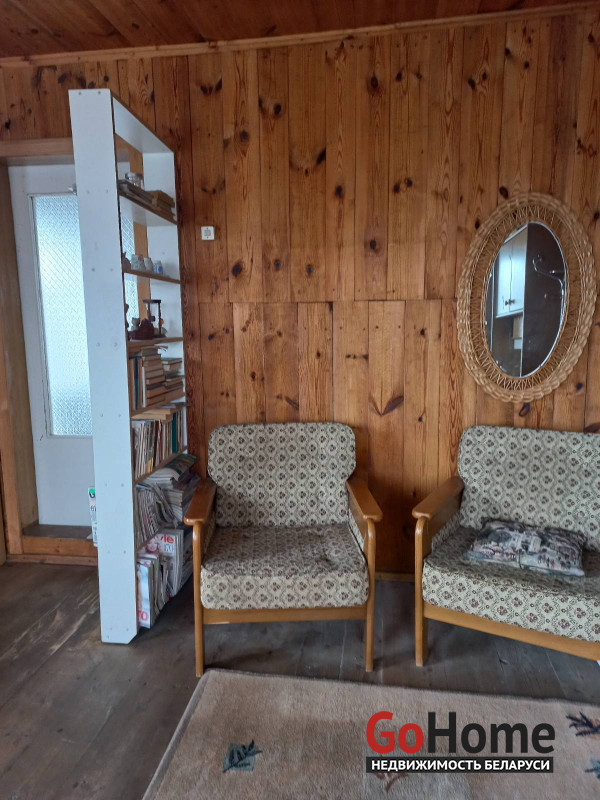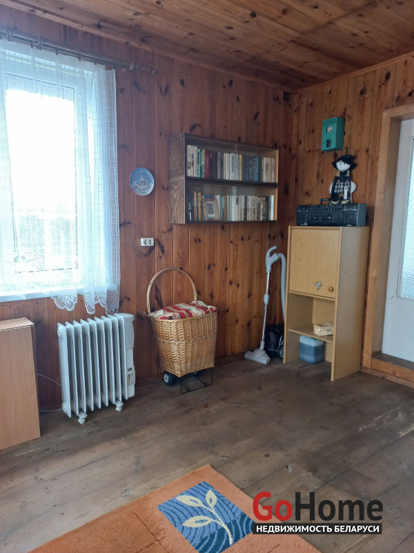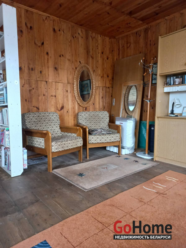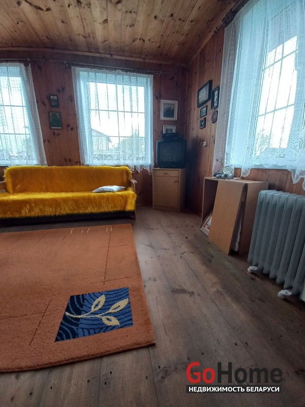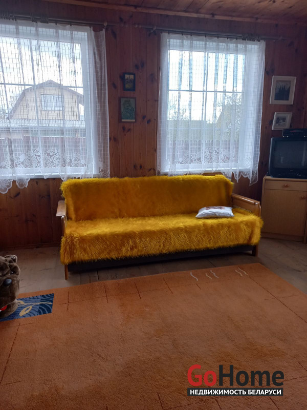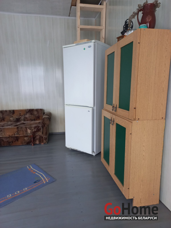 Дачный дом с перспективой на два уровня. 1 этаж: кухня и жилая комната. Готовность 90%. Материалы новые. Жилая зона – деревянный сруб 5 х 5м, (рублен в Крупском лесничестве, собирался на месте) изнутри обит вагонкой, снаружи сайдинг. Зона кухни-столовой – силикатные блоки 5 х 4м. Дом теплый, сухой, стены зимой не промерзают. В прошлом году были вставлены новые стеклопакеты. Отопление электрическое. Общая площадь первого уровня 45 м2.