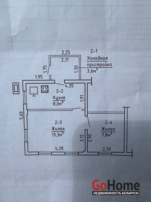 Квартира общая площадь 32,7 м2. 2 комнаты , одна проходная ,кухня, пристройка .