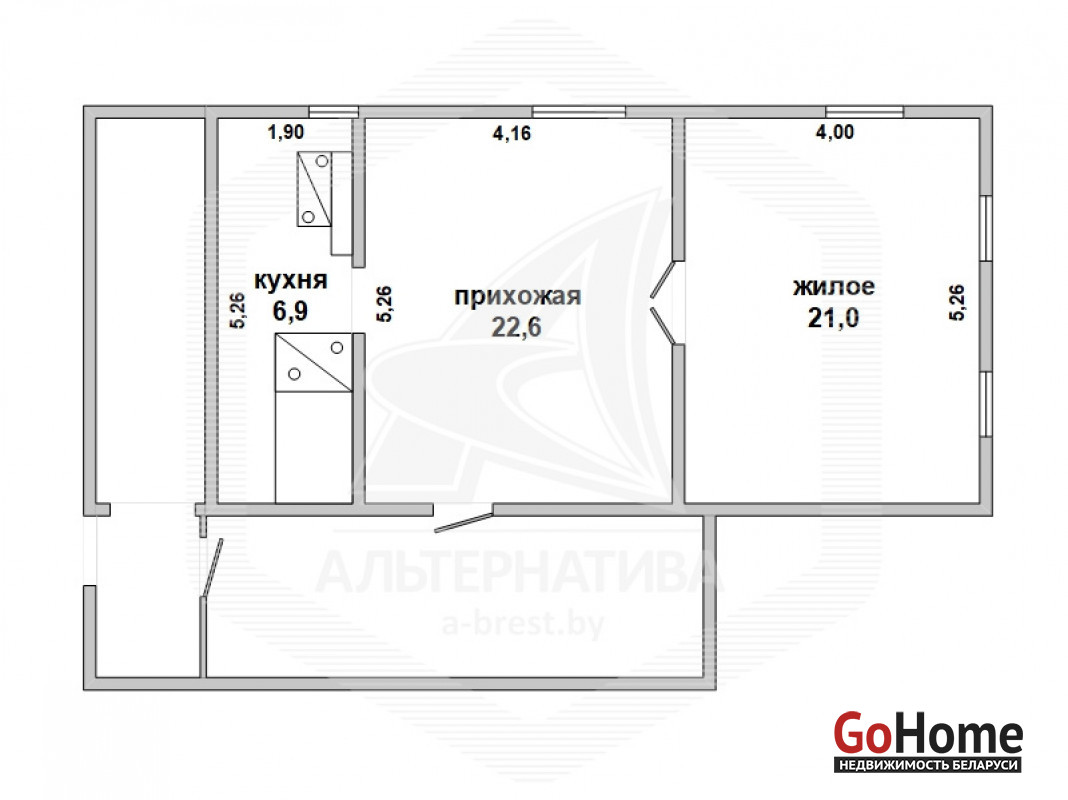 Жилой дом в Брестском р-не. 1955 г.п. 1 этаж. Общ.СНБ - 79,9 кв.м, общ.- 50,5 кв.м, жил.- 21,0 кв.м, кух.- 6,9 кв.м. 1 комната, высота потолка - 2,20 м.