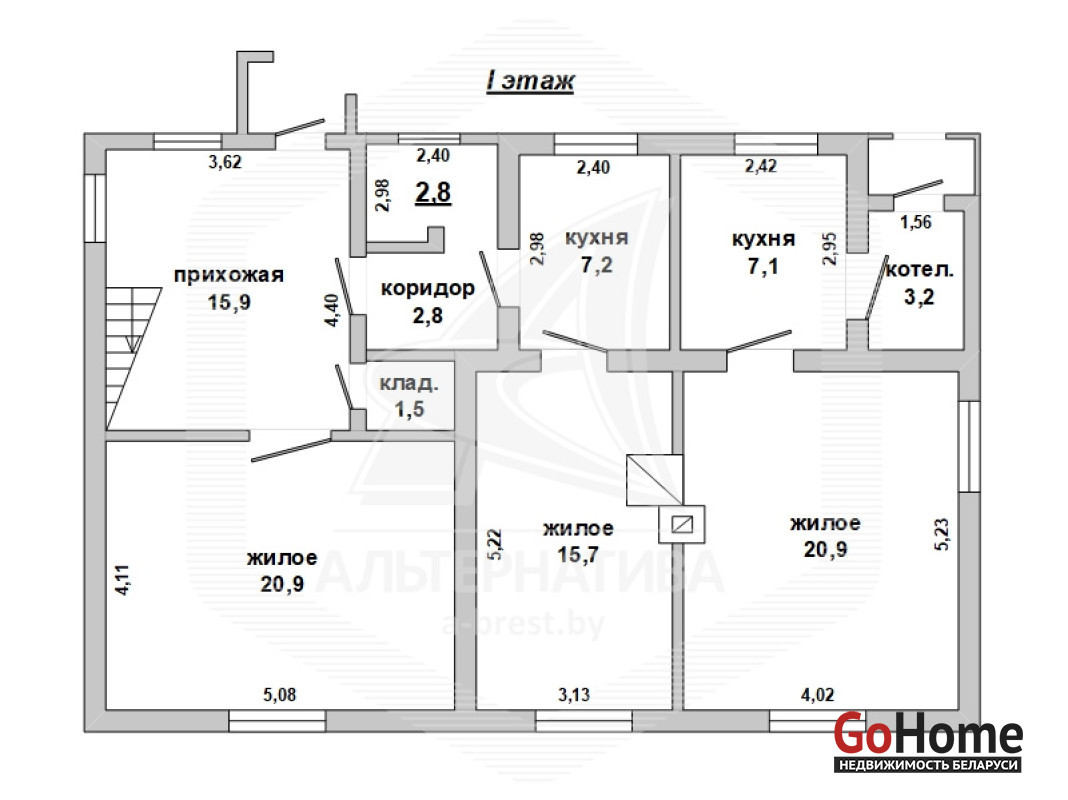 Жилой дом в г.Бресте. 1963 г.п. 1 этаж, мансарда. Общ.СНБ - 112,7 кв.м, общ.- 111,4 кв.м, жил.- 70,9 кв.м, кух.- 7,1 + 7,2 кв.м. 4 комнаты, высота потолка - 2,70 м.