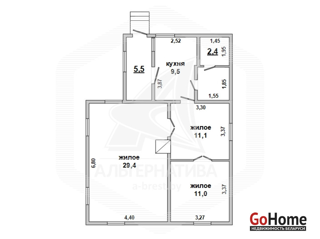 Жилой дом в Жабинковском р-не. 1971 г.п. 1 этаж. Общ.СНБ - 71,8 кв.м, общ.- 66,3 кв.м, жил.- 51,5 кв.м, кух.- 9,5 кв.м. 3 комнаты, высота потолка - 2,6 м.