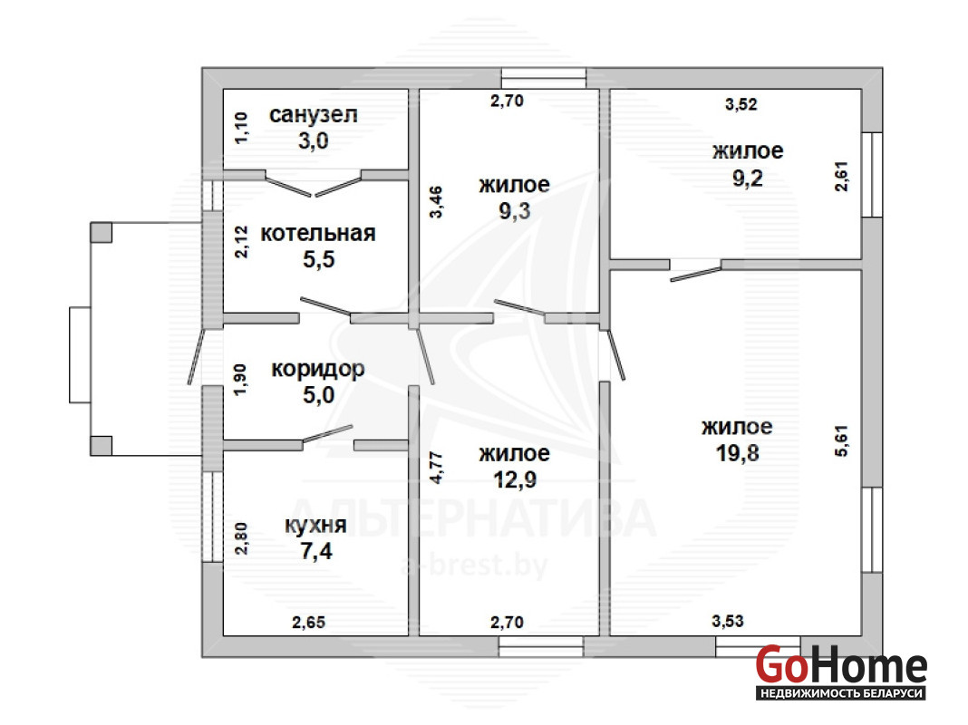Жилой дом в г.Кобрине. 1999 г.п. 1 этаж. Общ.СНБ - 72,1 кв.м, общ.- 72,1 кв.м, жил.- 51,2 кв.м, кух.- 7,4 кв.м. 4 комнаты, высота потолка - 2,60 м.