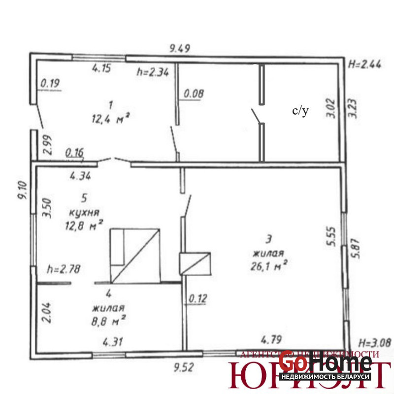 Площадь общая по СНБ – 75.2 м2, общая жилая - 47.7 м2 , жилая – 34.9 м2, кухня – 12.8 м2.