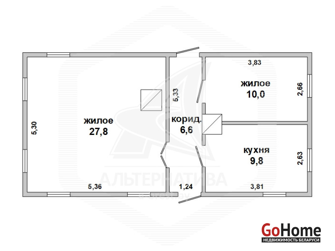 Жилой дом в Жабинковском р-не. 1956 г.п. 1 этаж. Общ.СНБ - 54,2 кв.м, общ.- 54,2 кв.м, жил.- 37,8 кв.м, кух.- 9,8 кв.м. 2 комнаты, высота потолка - 2,09 м.