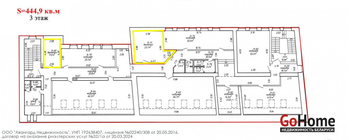 3 этаж целиком: общая площадь 444,9 кв.м.