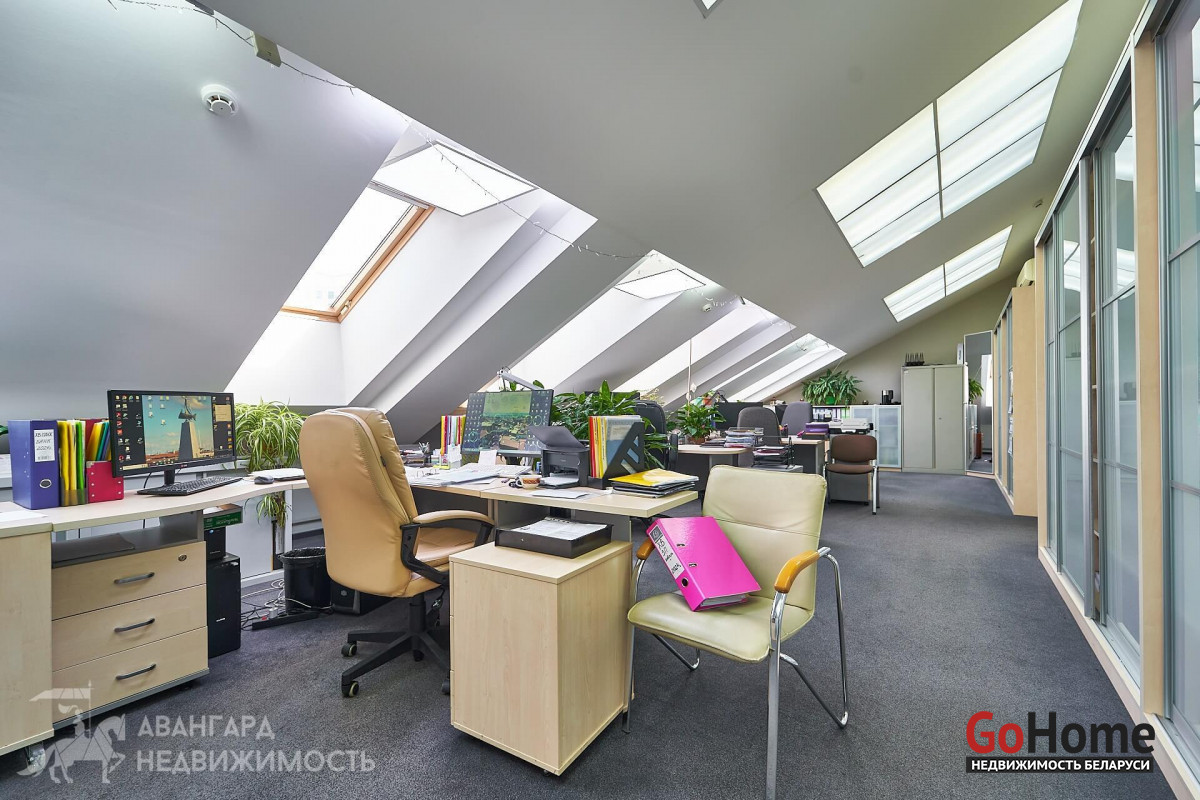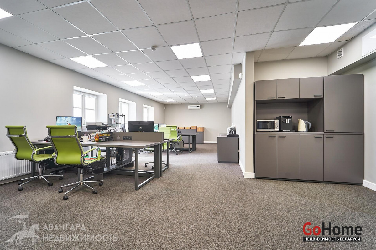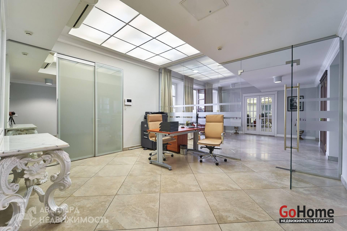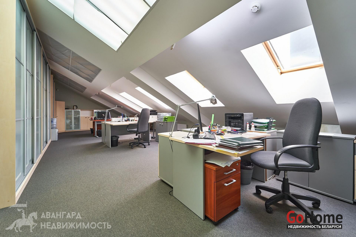 Первый этаж состоит из: 3-х кабинетов формата open space, приемной, кабинета директора, оборудованной кухни с подводом воды, подсобного помещения, отапливаемой эксплуатируемой галереи, собственных санузлов. Имеется два отдельных входа. Есть возможность использовать объект для размещения шоурума, проведения конференций.