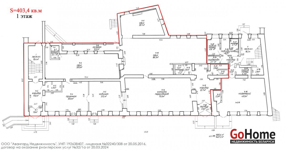 офисный блок на 1 этаже общей площадью 403,4 кв.м;
