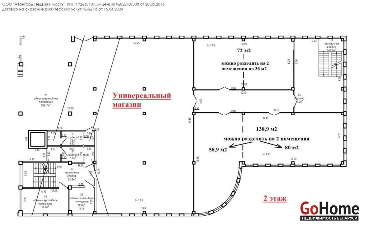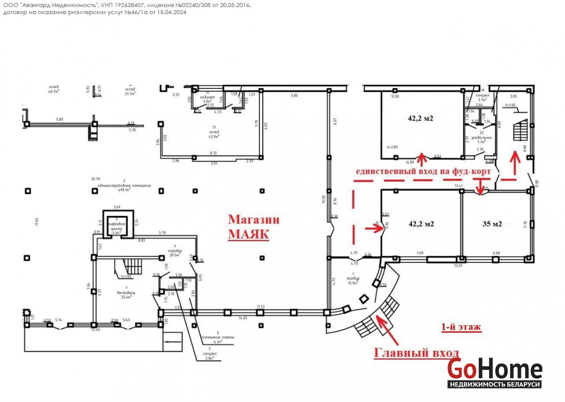 помещения на 1-м этаже: 35.1 кв.м, 42.2 кв.м, 42.2 кв.м. помещения на 2-м этаже: 72 кв.м, 138,9 кв.м. Важно! Помещения, расположенные на 2-м этаже, сдаются по ставке 6 долларов /кв. м.