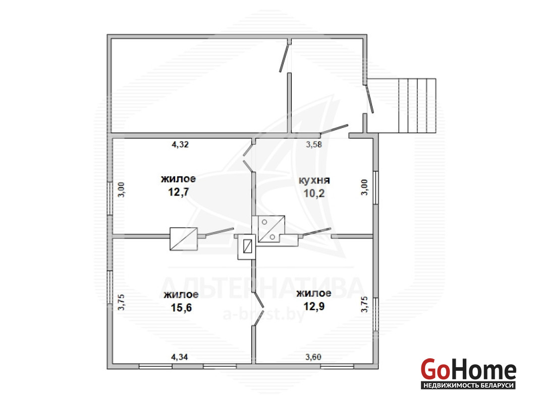 Жилой дом в Каменецком р-не. 1945 г.п. 1 этаж. Общ.СНБ - 73,1 кв.м, общ.- 51,6 кв.м, жил.- 41,4 кв.м, кух.- 10,2 кв.м. 3 комнаты, высота потолка - 2,90 м.