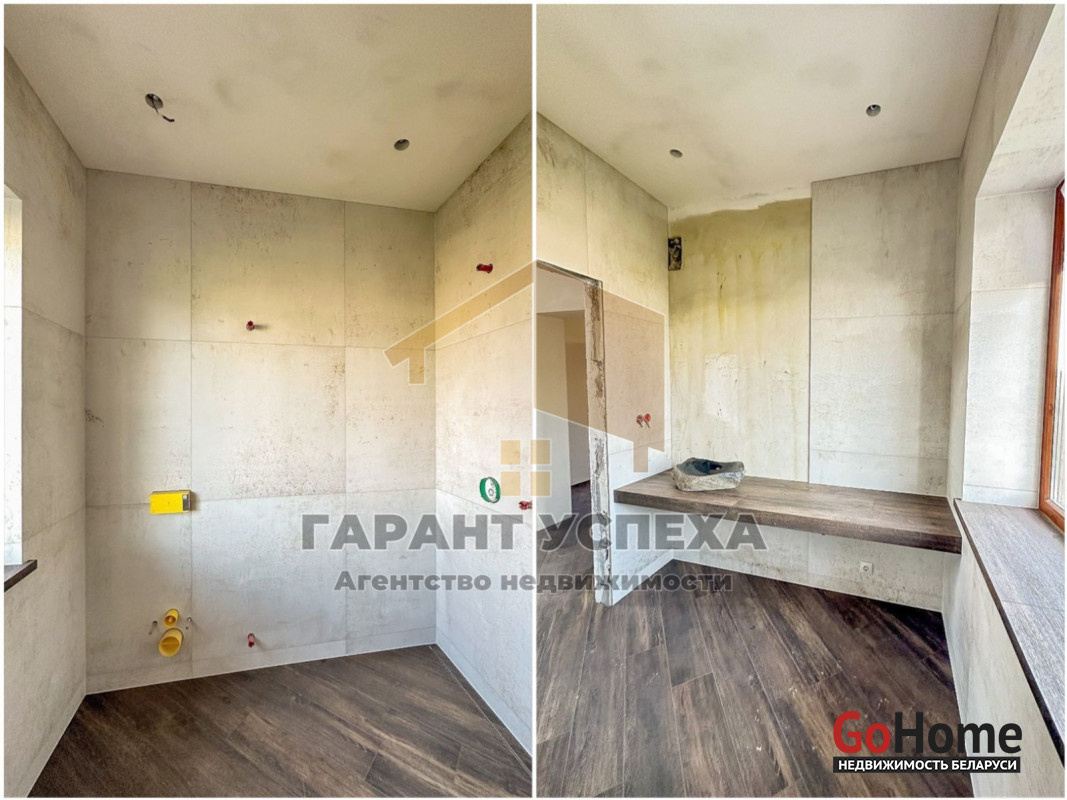 Фундамент - монолитная плита, выполнен по немецкой технологии, стены из блока керамзитобетон (Новолукомль), утеплен минватой Parok 50mm со стеклохолстом. Облицован клинкерным кирпичом Керамин. Внутренние работы завершены на стадии, предваряющей финишную отделку (оштукатурено, зашпатлевано, стеклохолст).