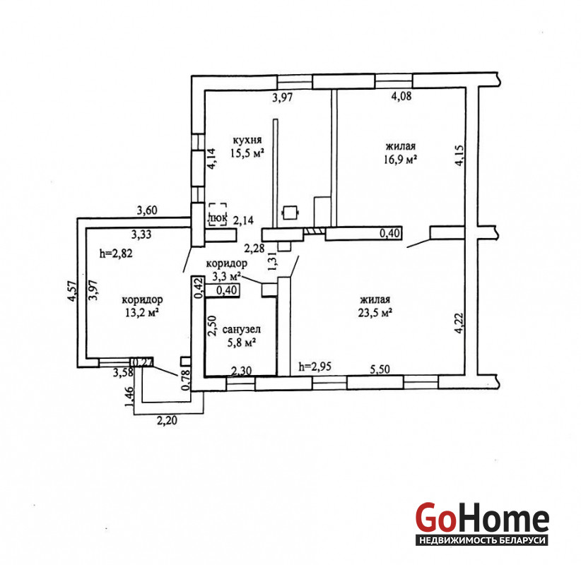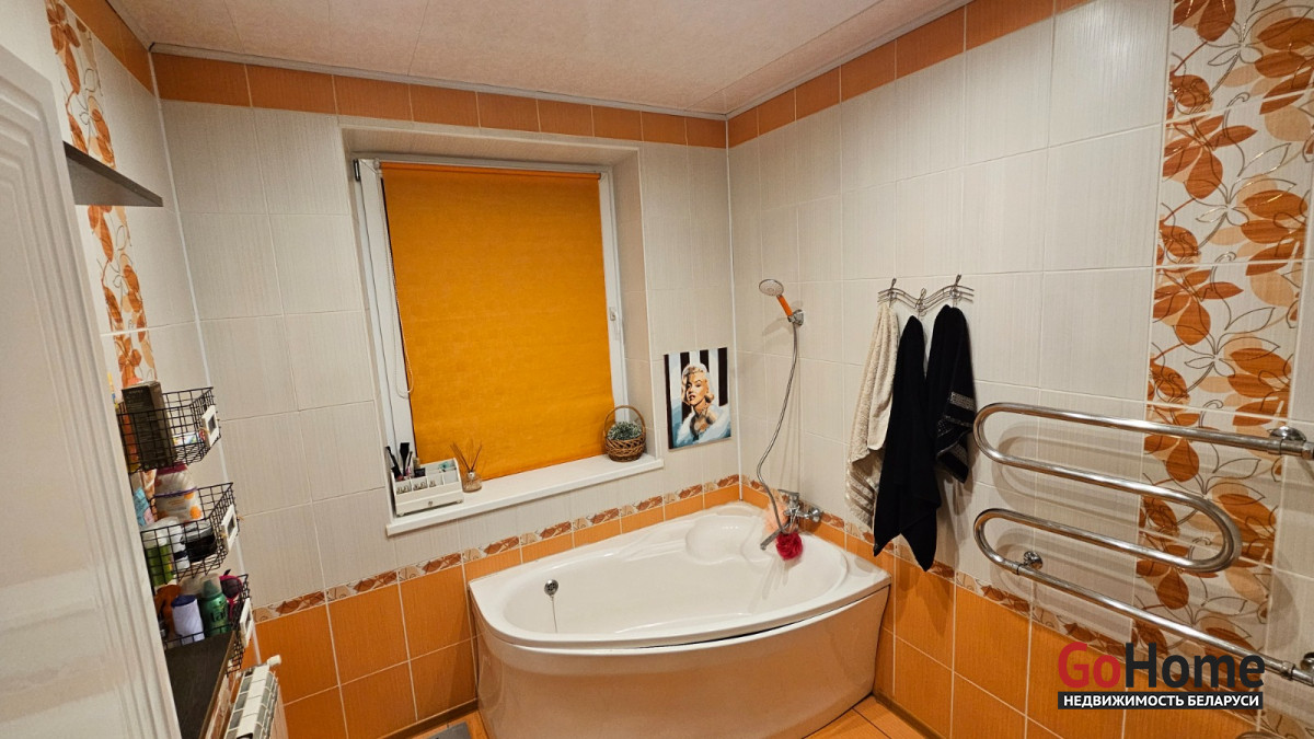 Площадь половины дома по СНБ 78,2 м.кв, общая площадь квартиры 65,0/ 40,4/15,5 м.кв. Одноэтажный шлакобетонный дом мансардного типа 1957 года постройки. Крыша шифер, окна ПВХ, входная дверь металлическая. Отопление – двухконтурный газовый котел, канализация местная (септик).