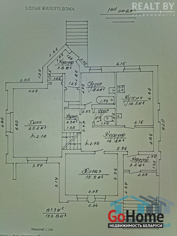 Участок 15 соток в пожизненно наследуемом владении. Площадь дома 233,8/193,8/81,3/14,5 м2. Материалы: кирпич, шифер.