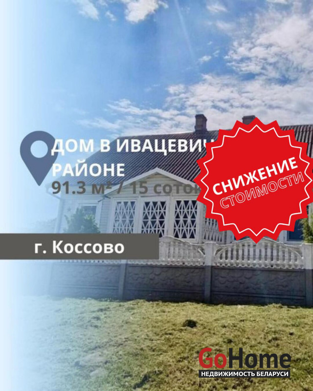 Дом в центре города Коссово (Ивацевичский район). Общая площадь - 91.3 м2, жилая - 57.2 м2, кухня - 7.9. Дом состоит из 3 изолированных спальных комнат. Погреб есть как в доме, так и на улице. Коммуникации: электричество; вода - скважина; канализация - местная; газ - есть; отопление - как газовое, так и печное. Летняя кухня оборудована действующим с/у со стиральной машиной. Площадь участка - 15 соток. Участок огорожен, асфальтный подъезд. Помимо летней кухни на участке размещаются 5 сараев, гараж.