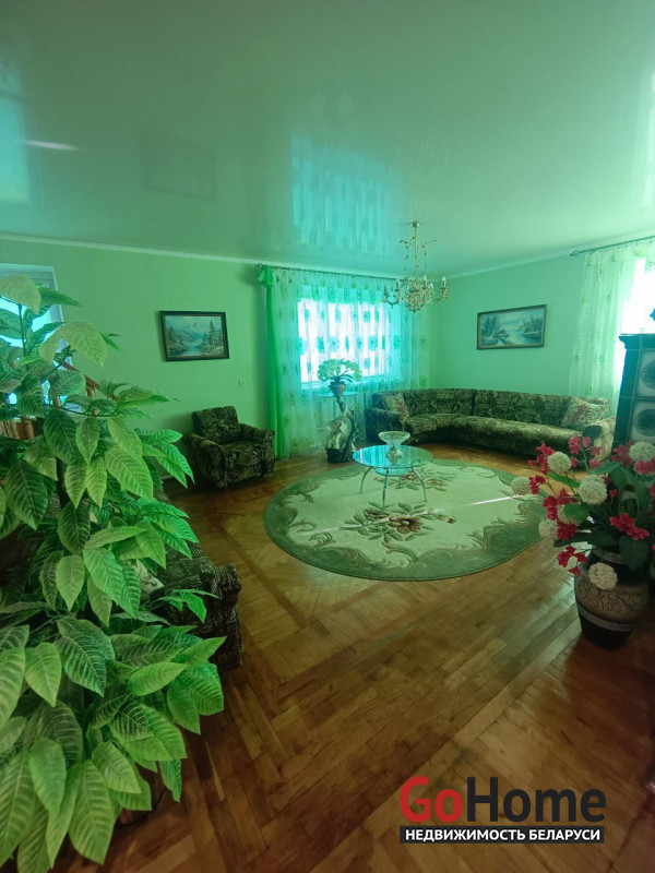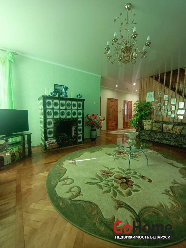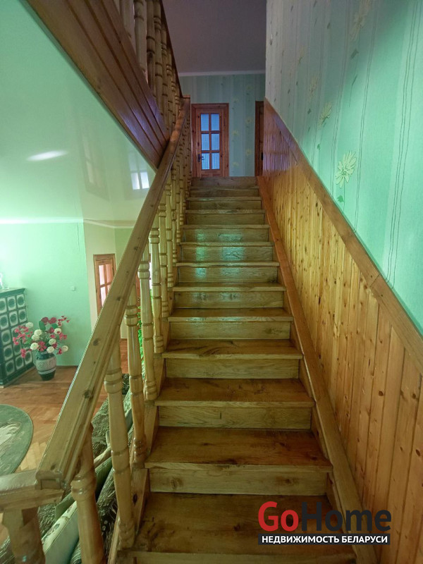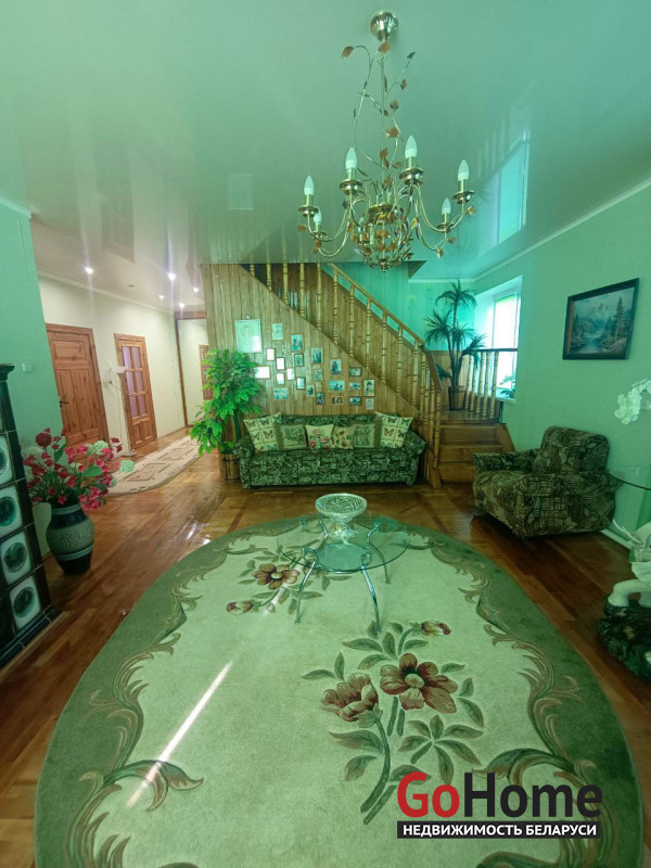 В доме имеется технический этаж, где расположены кладовая, котельная и гараж с ямой. На полу в доме уложен паркет, окна выполнены из ПВХ, натяжные потолки, установлены деревянные межкомнатные двери.