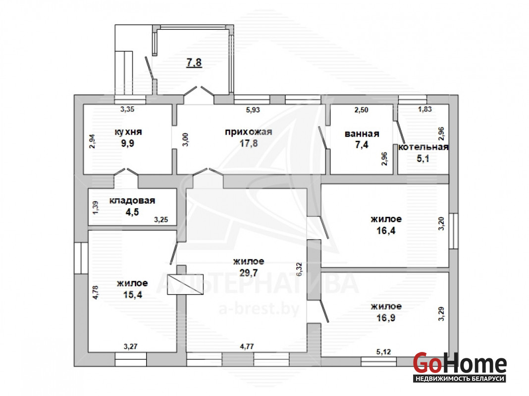 Коробка жилого дома в Каменецком р-не. 1966 г.п. 1 этаж. Общ.СНБ - 130,9 кв.м, общ.- 123,1 кв.м, жил.- 73,4 кв.м, кух.- 17,8 кв.м. 4 комнаты, высота потолка - 2,40 м.