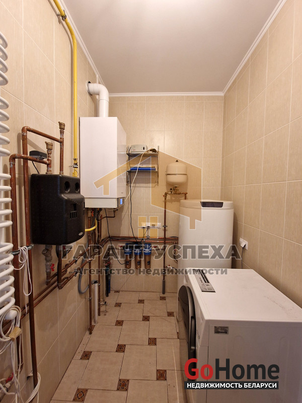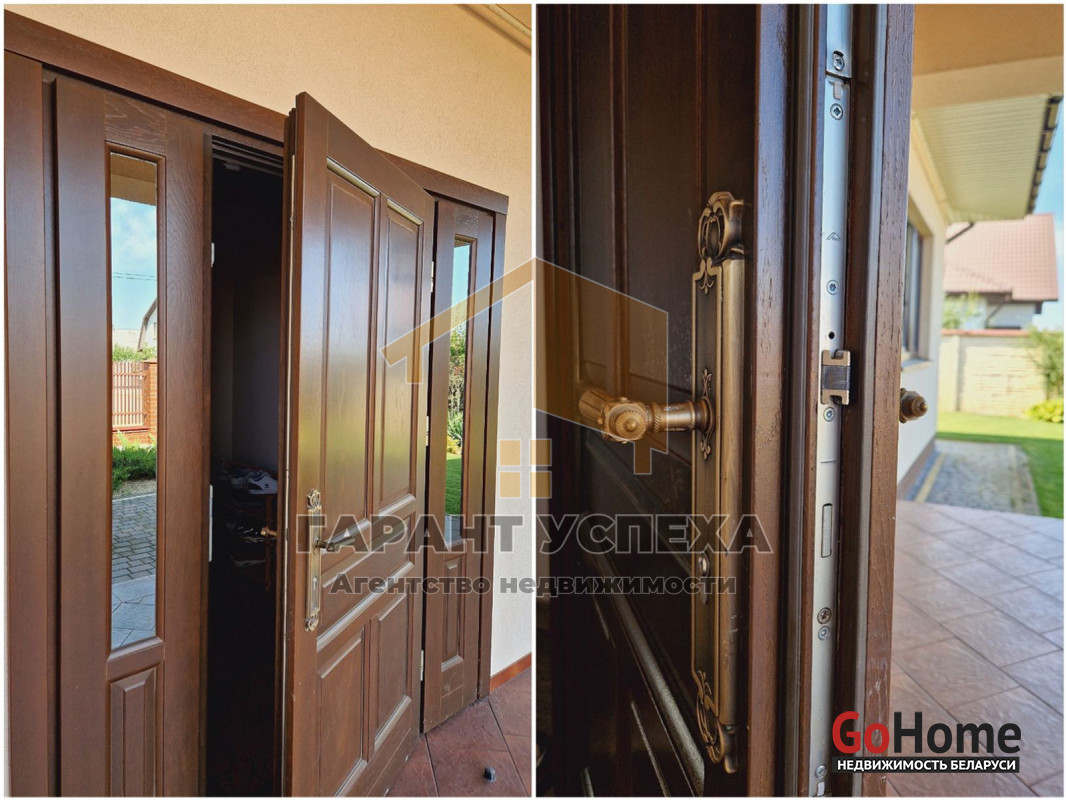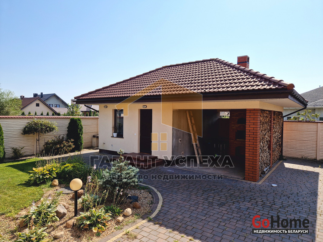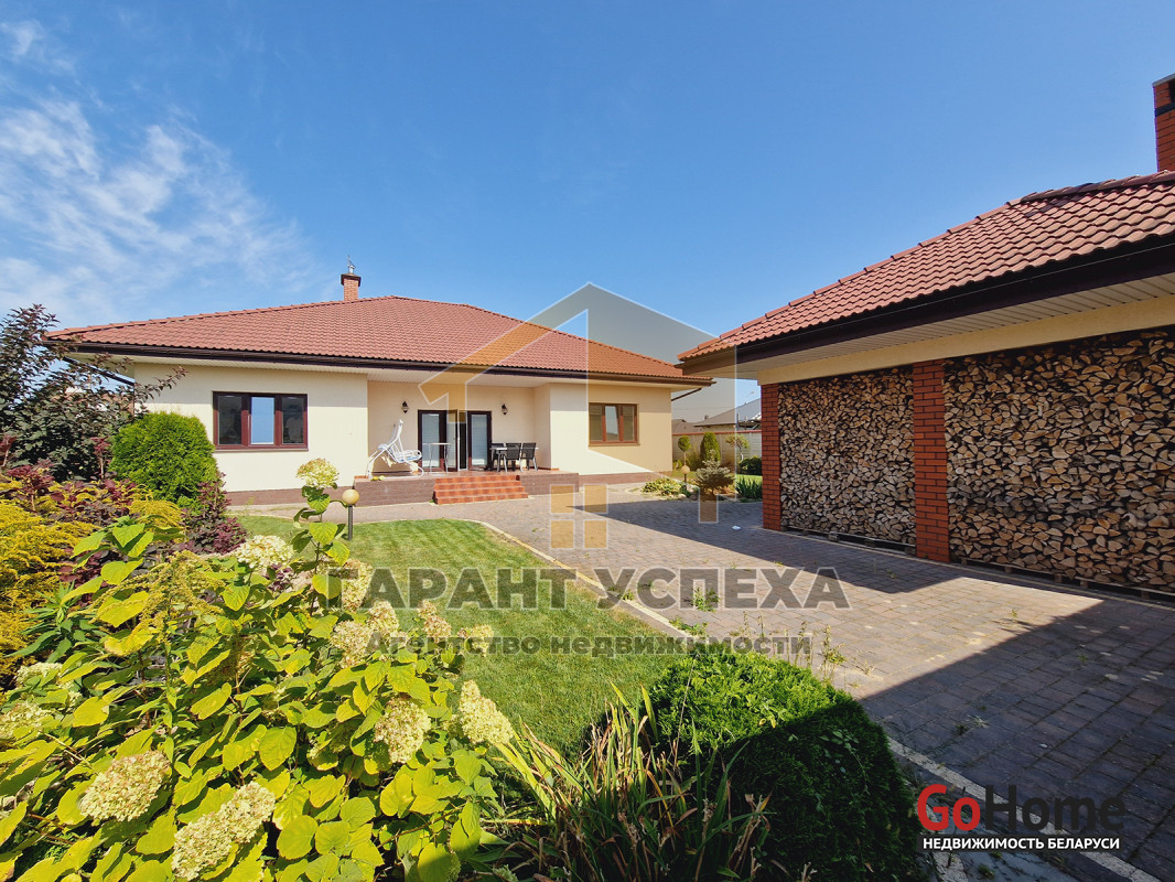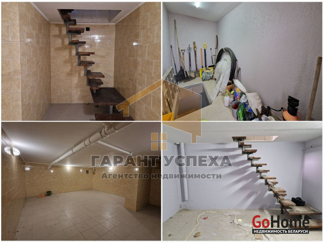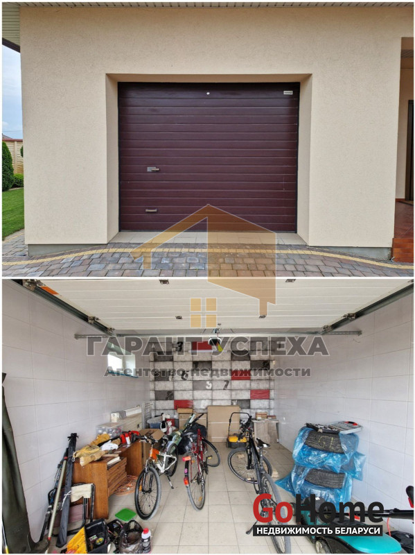 В дом встроен гараж 22,79 кв. м с автоматическими воротами. Стены и пол облицованы плиткой. В гараже есть польская откидная чердачная лестница.