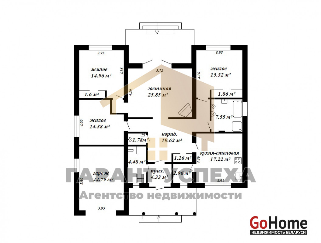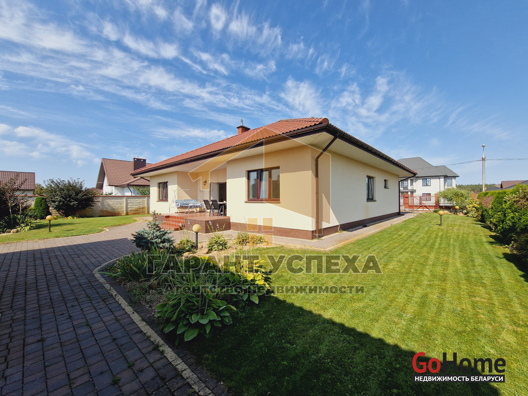 Общая площадь –129,2 кв. м, три жилые комнаты 15/15,32/14,4 кв. м, гостиная 25,85 кв. м, отдельная кухня 17,22 кв. м. Высокие потолки. Под домом есть обустроенный подвал.