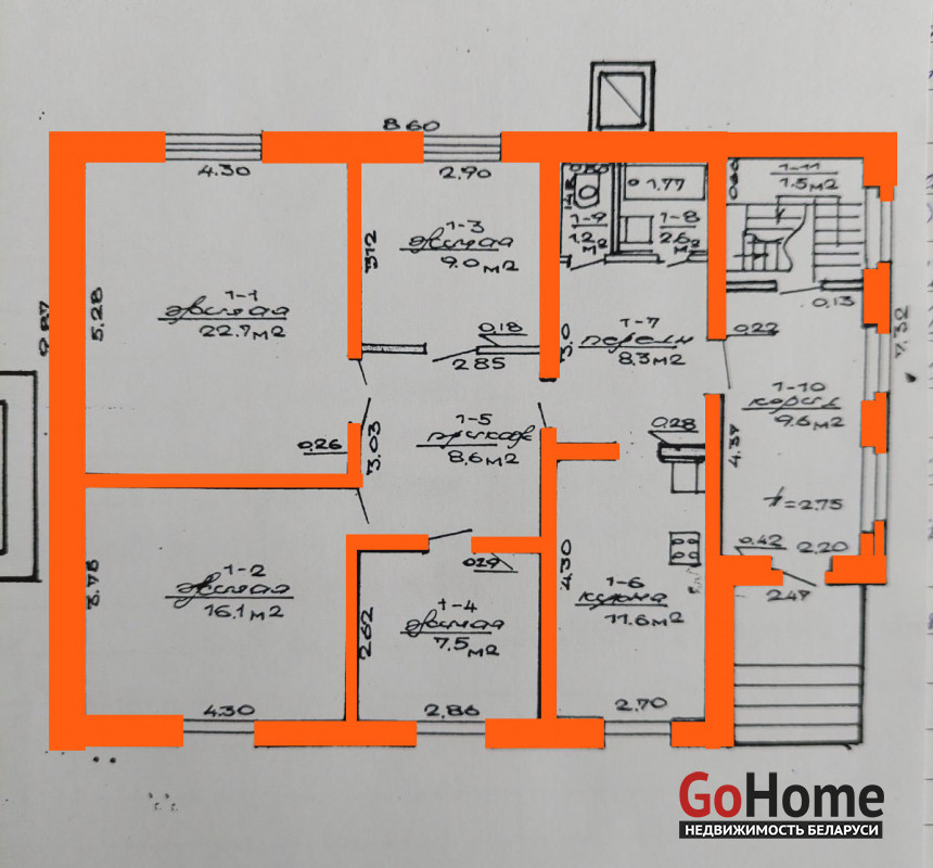 подвальный этаж- гараж на 2 машины, мастерская, кладовые, кухня и ванная комната; 1 этаж- 4 жилых комнаты, кухня, с/у раздельный, коридор; мансардный этаж. В доме центральное водснабжение, отопление: газовый котел, электрокотел, котел на твердом топливе; канализация местная, электричество 220В и 380В.
