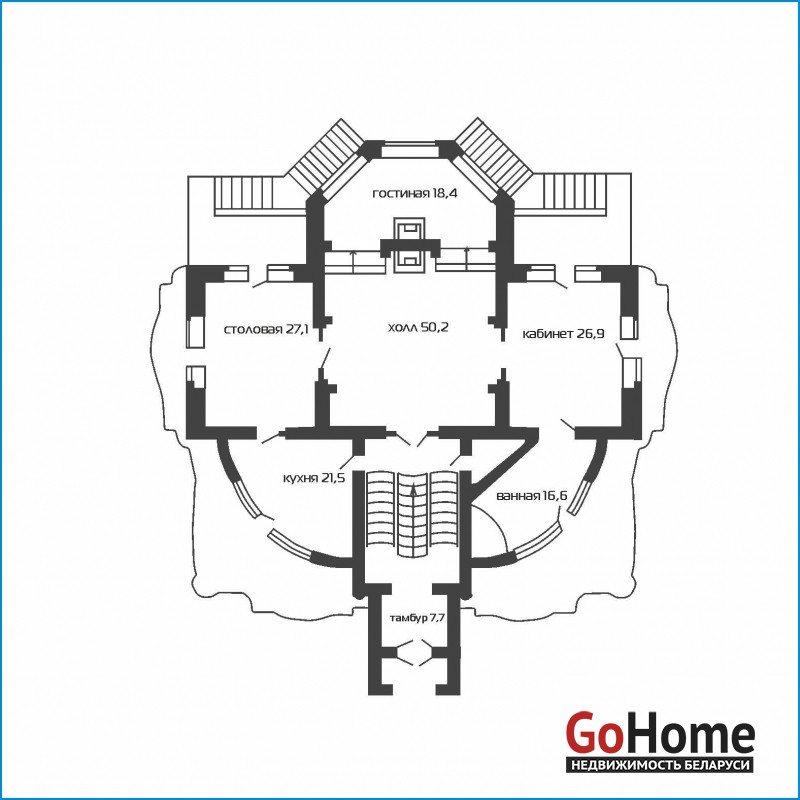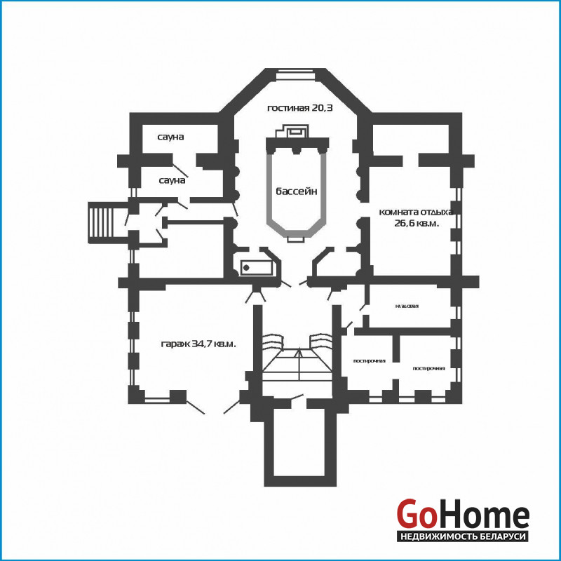 Цокольный этаж представляет собой настоящую зону отдыха с бассейном, сауной и бильярдным залом, а также комнатой с камином, идеально подходящей для расслабления. Здесь же расположено постирочное помещение, укомплектованное всей необходимой техникой.