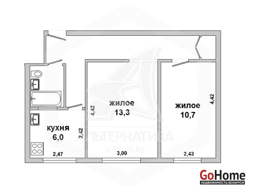 2-комнатная квартира, г. Брест, б-р Космонавтов, 1961 г.п., 1 / 4 кирпич, 42,3 / 42,3 / 24,0 / 6,0, санузел совмещенный, подвал, деревянные двухкамерные стеклопакеты, межкомнатные двери - шпон, потолки - снежка (в комнатах, в коридоре) и натяжной сатин (в кухне), полы - ламинат (положен на доску), стены оклеены обоями и отделаны камнем (в кухне, в прихожей), в санузле современная плитка, заменена сантехника, заменен полотенцесушитель, заменены сантехнические трубы (пластик), акриловая ванна, проведена новая электропроводка, установлены новые радиаторы, новый электросчетчик, телефон, домофон. Квартира с хорошим ремонтом. Чистый подъезд. Капитальный ремонт дома 2014г. Заменены внутридомовые коммуникации. Произведен ремонт крыши. Утепление дома шубой и боковых фасадов дома. Отличный вариант для вывода в нежилой фонд. Лот - 242199